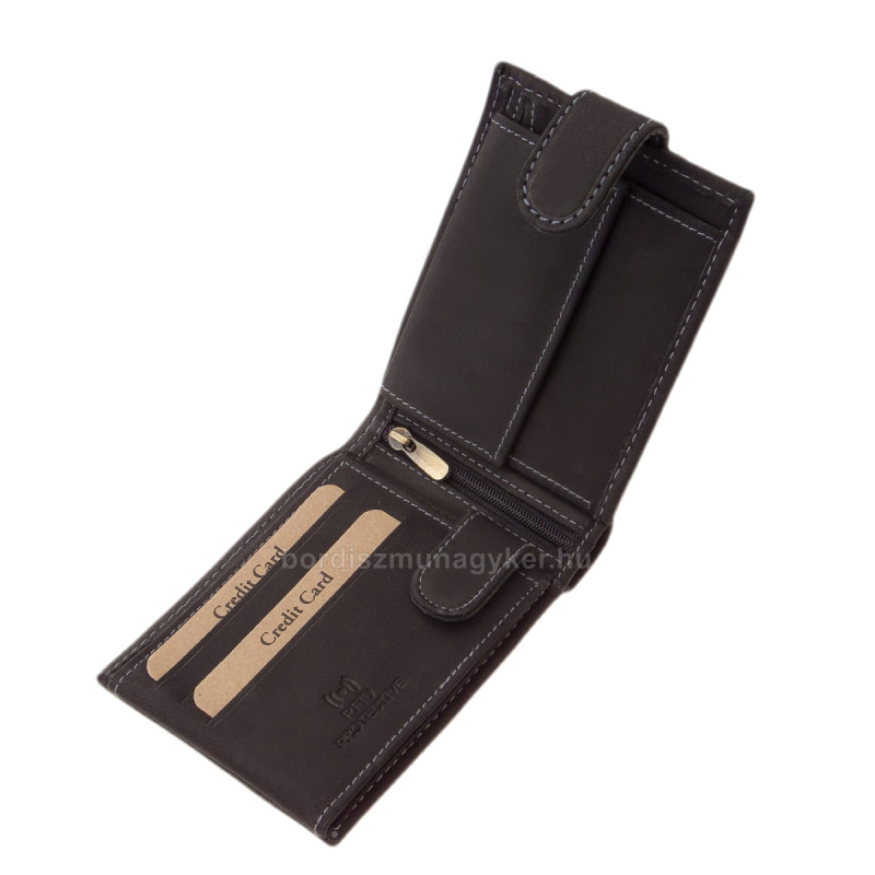 Peňaženku možno ľahko a bezpečne uzavrieť vonkajším prepínacím jazýčkom. Bezpečnosť zvyšuje zabudovaná ochranná vrstva RFID, ktorá chráni pred nelegálnym čítaním údajov.