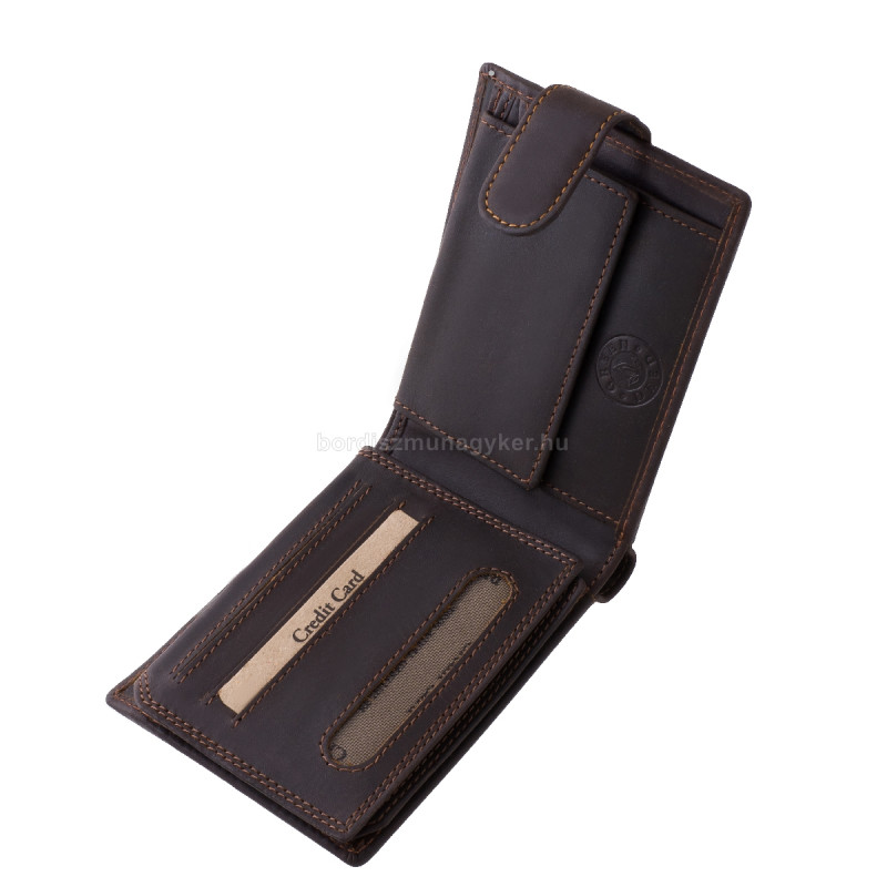 Úgynevezett rusztikus vadászbőrből gyártott, egyedi kidolgozású GreenDeed sportos bőr pénztárca férfi vásárlóinknak mely átkapcsoló pánttal zárható.