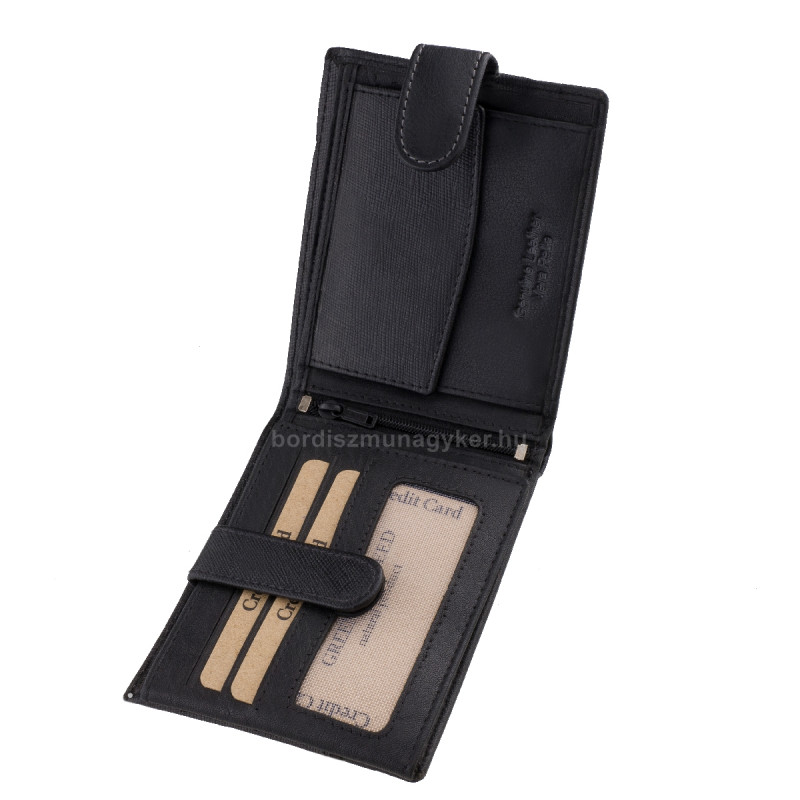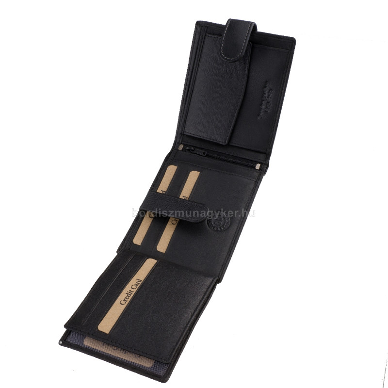 A valódi bőr férfi pénztárca elegáns fedelére továbbá egy átkapcsoló pánt is került, melynek köszönhetően jóval biztonságosabb a használata.