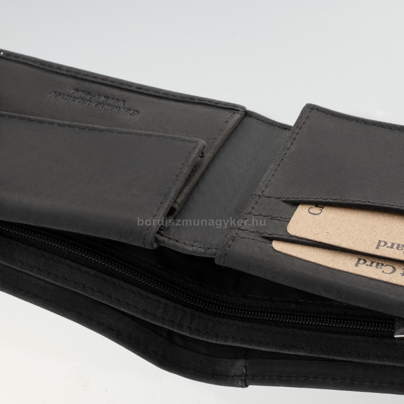 De portemonnee is uitgevoerd in naturel zwart, wat geaccentueerd wordt door de donkergrijze sierstiksels.