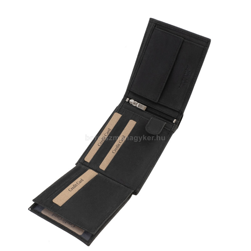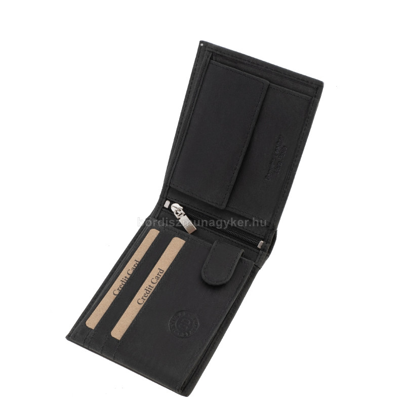 Een zwarte herenportemonnee met een natuurlijk leren oppervlak, die uiterst comfortabel in gebruik is.
