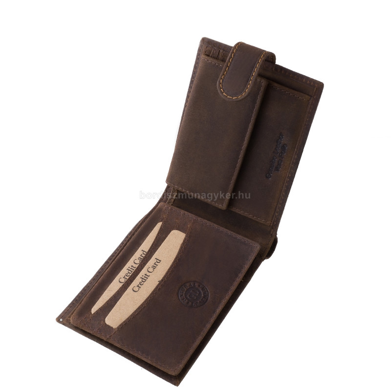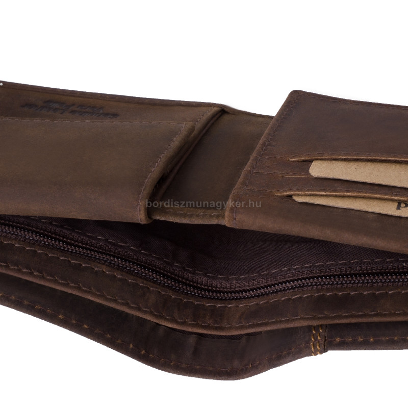 Úgynevezett "vadász" vagy más néven vintage stílusú valódi bőr pénztárca férfi vásárlóink számára tervezett praktikus belsővel, natúr díszdobozos kivitelben.