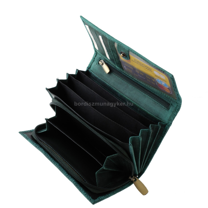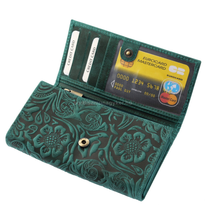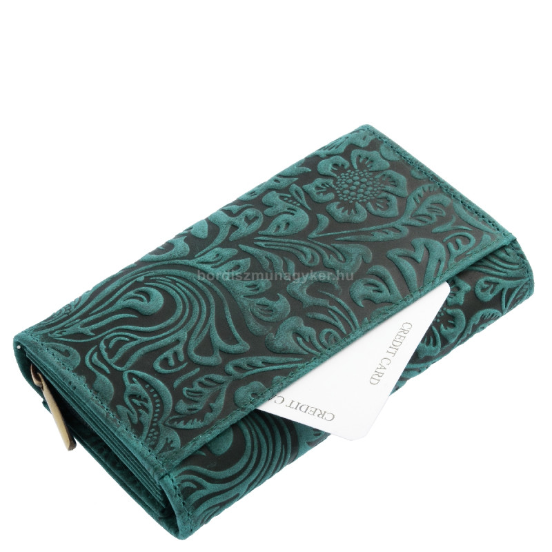 A rusztikusabb stílusú bőrfelületen nagyon szépen kirajzolódó, a pénztárca teljes felületén végigfutó virágos benyomás látható, mely elegáns ugyanakkor divatos megjelenést biztosít.