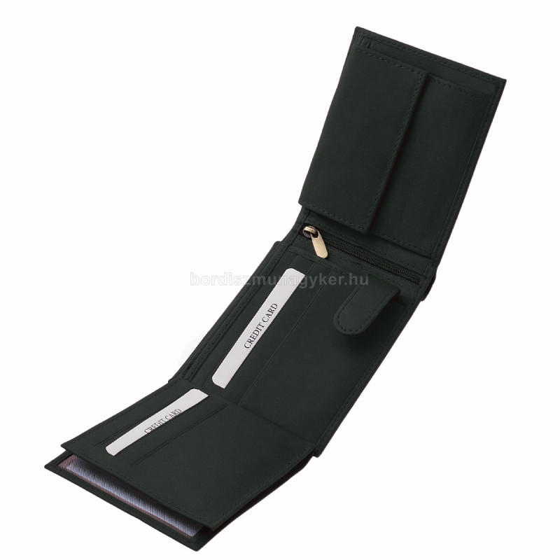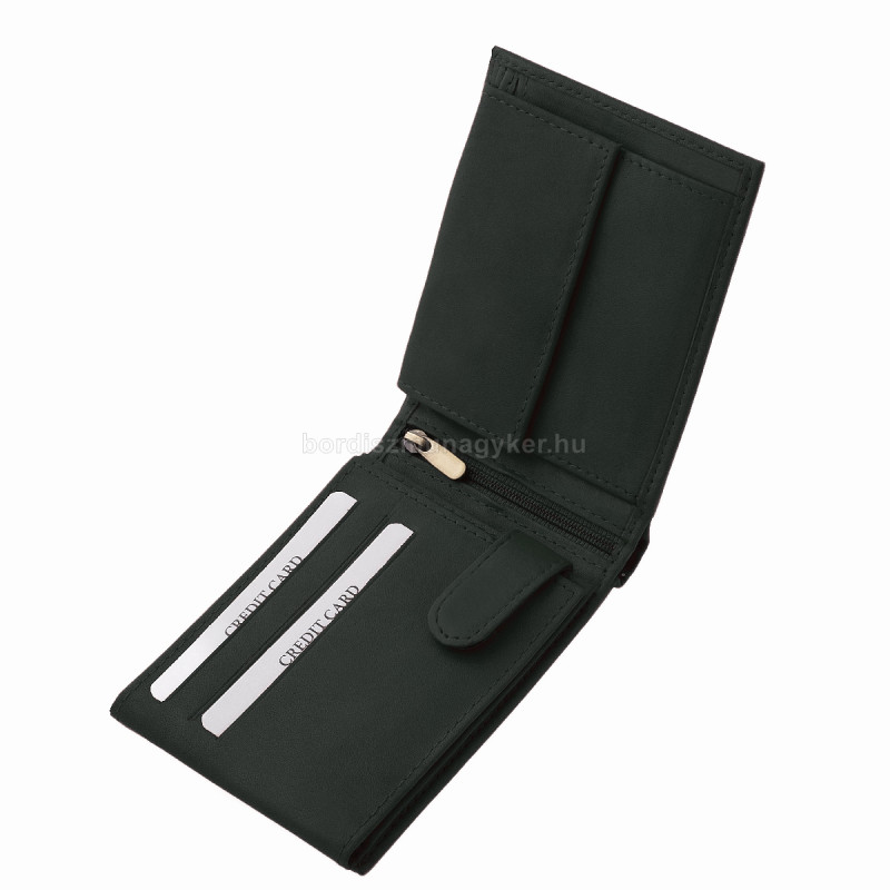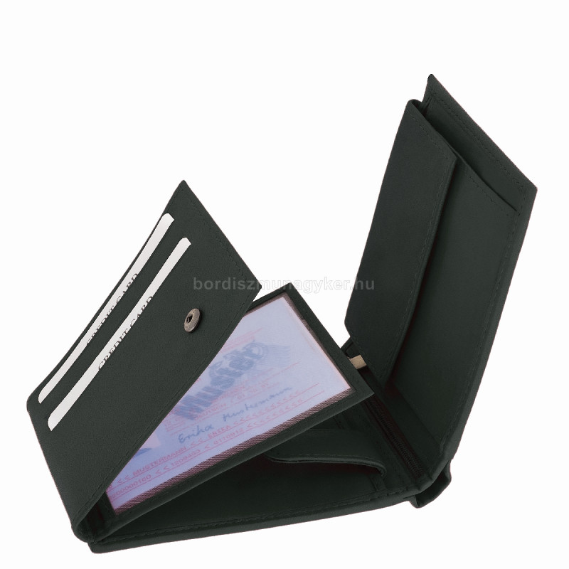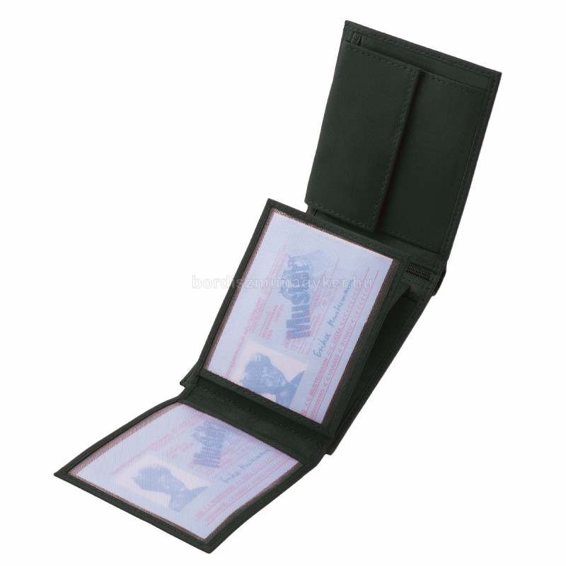 - A pénztárca bal oldalán két oldalt kihajtható irat- és kártyatartó található, amelyet egy patentos bőr pánt rögzít.