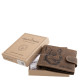 A pénztárca kezeletlen papírból készült natúr díszdobozban érkezik, amely tökéletesen harmonizál a bőr rusztikus megjelenésével.