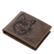 De omslag van onze rustiek ogende portemonnee van echt rundleer is versierd met een rijk gedetailleerd corgipatroon.