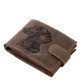 Rustykalna, ciemnobrązowa skórzana powierzchnia portfela ozdobiona jest jasnymi przeszyciami, które elegancko podkreślają wyjątkowe cechy i piękno naturalnego materiału.