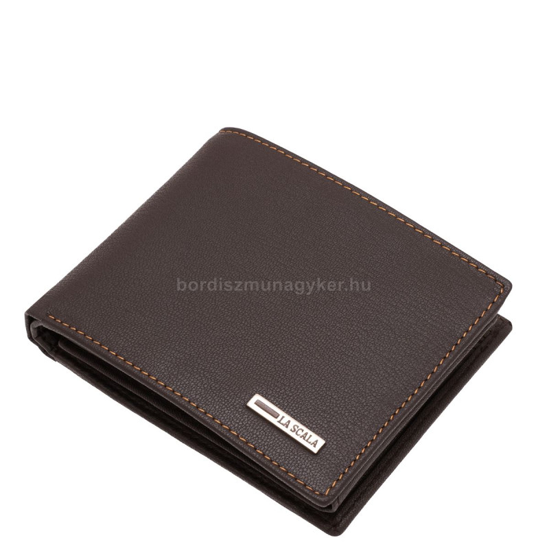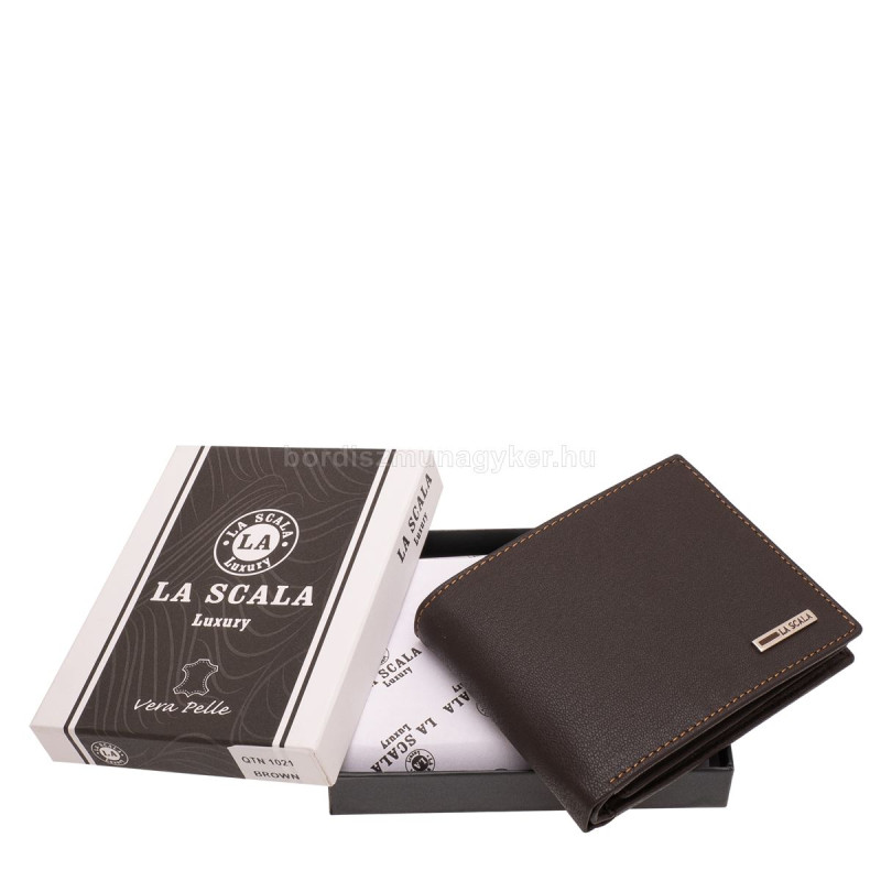 Elegáns valódi bőr férfi pénztárca modell fedelén a La Scala fémlogójával, stílusos díszdobozban kapható minőségi termék.