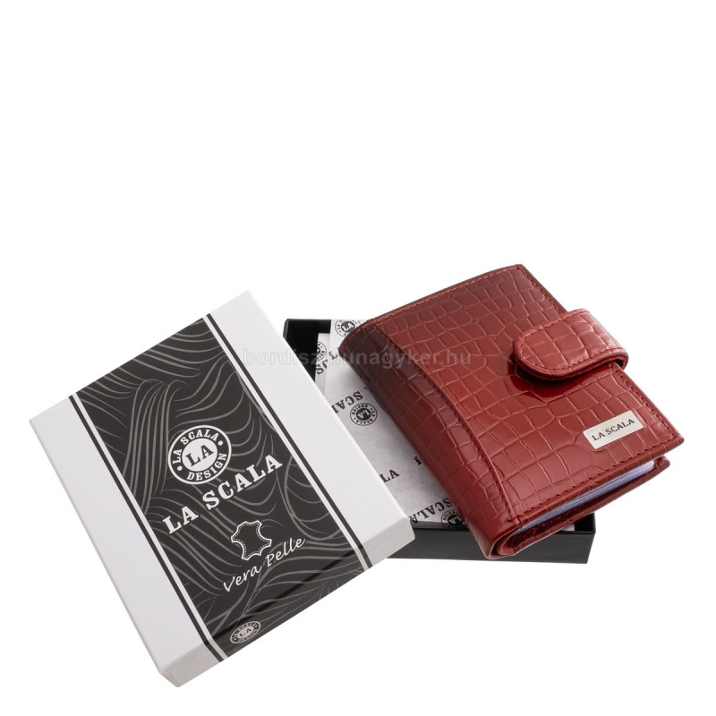 Dekoratív és igazán divatos modellünk ez a valódi bőr, La Scala márkás, croco mintás, álló elrendezésű kártyatartó, minőségi díszdobozban.