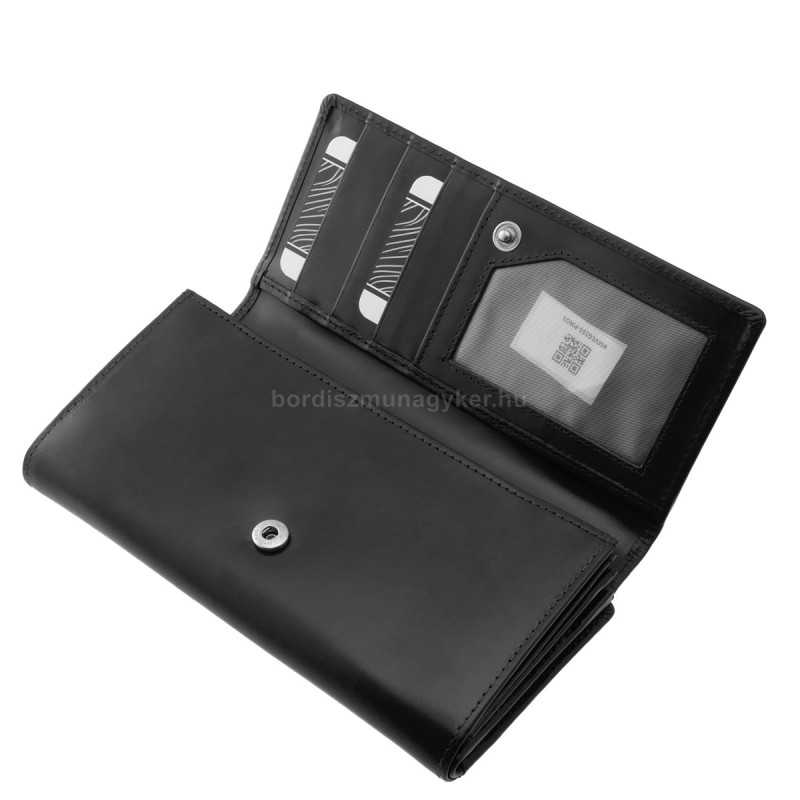 - Na zadní straně peněženky se nachází dvouřadá přihrádka na karty, kterou lze zapnout přepínacím popruhem a otevírat do strany, a dále je zde i fóliová přihrádka.