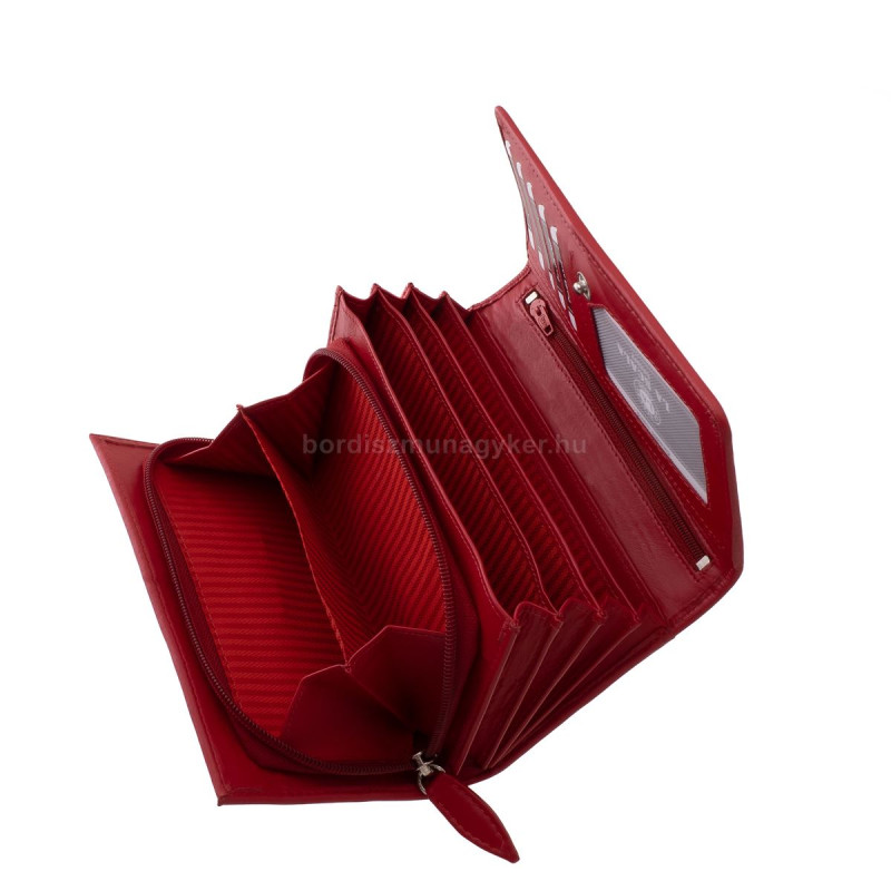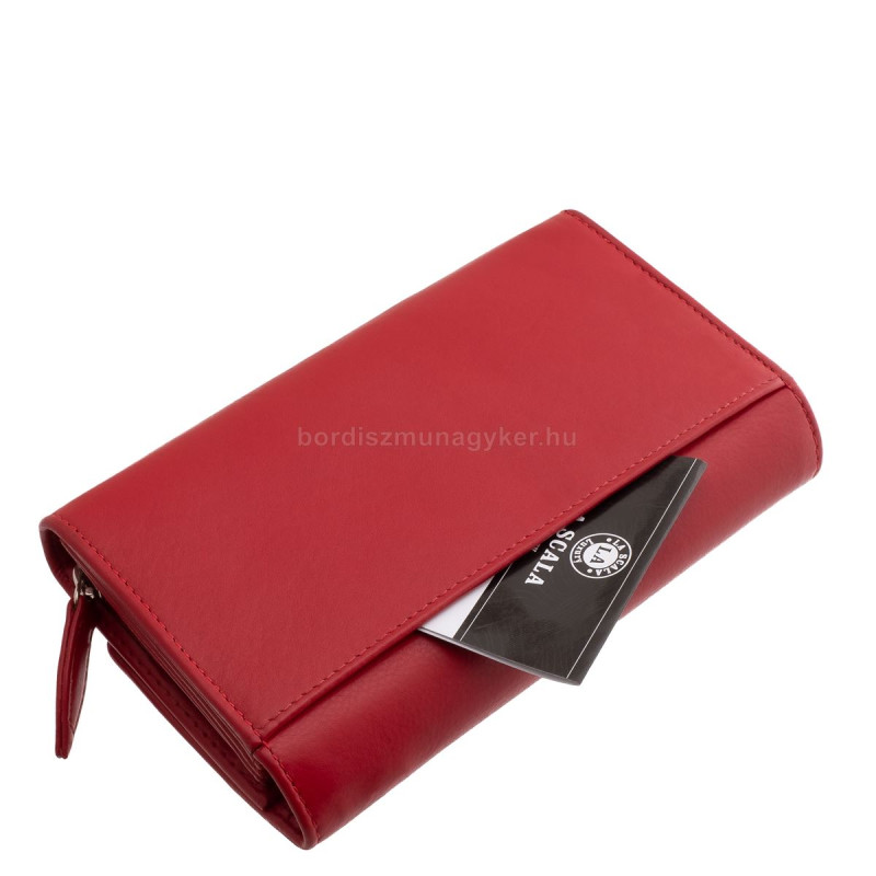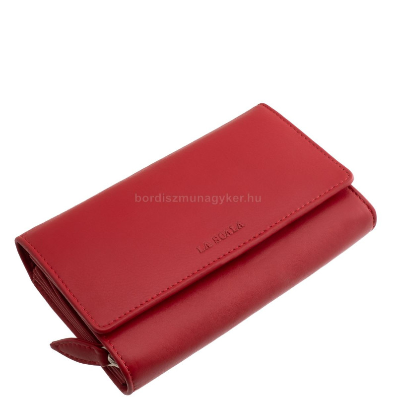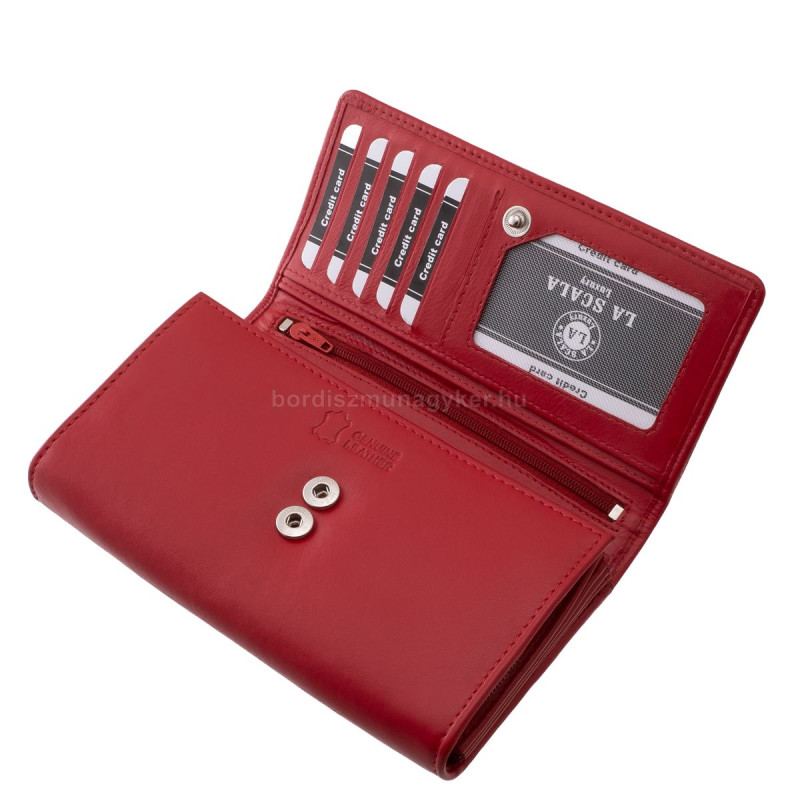 Valódi bőr női pénztárca a hétköznapok divatos kiegészítője, nőies piros színben gyártott praktikus kialakítású nagyméretű modell a La Scala márkától.