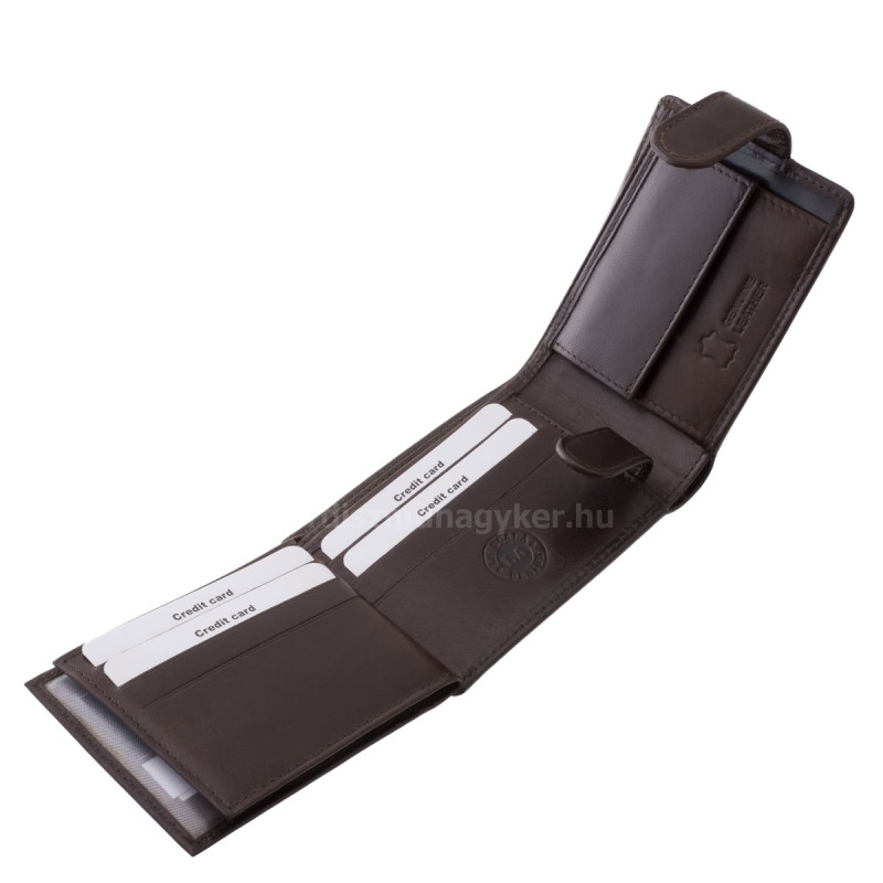Különlegessége, hogy a fedelén patentos átkapcsoló pánt található, amely biztonságosan zárja a pénztárcát, így tartalma mindig védve van.