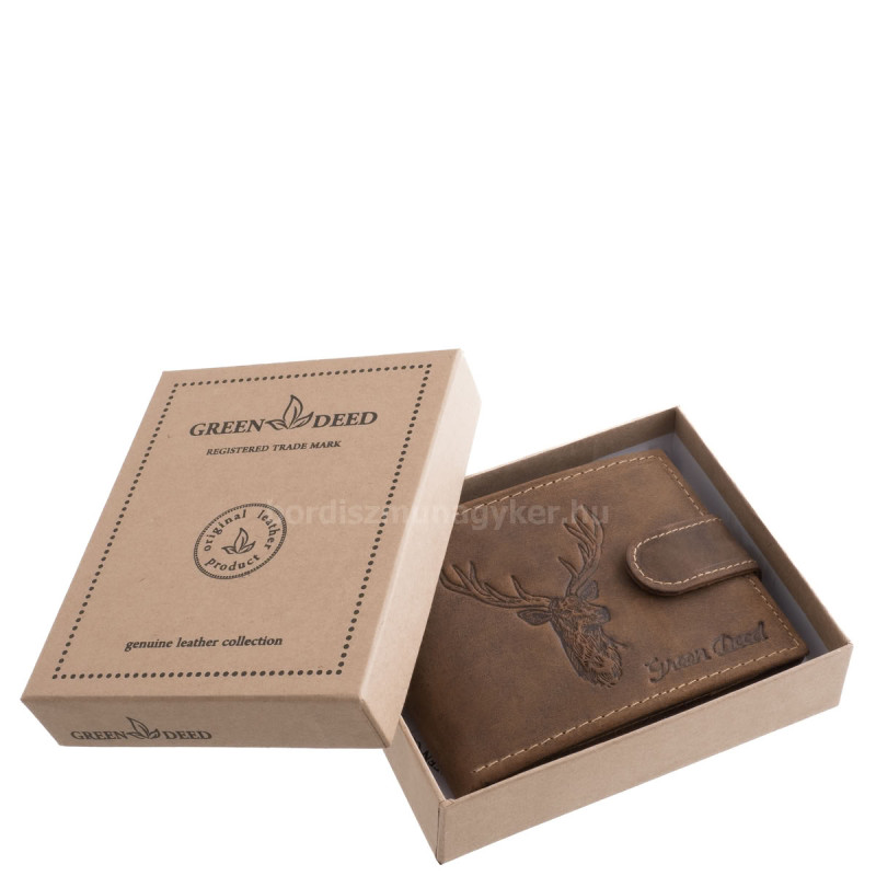 A genuine leather men's wallet decorated with a deer head print on the lid, which is a unique, small GreenDeed model, in a gift box.