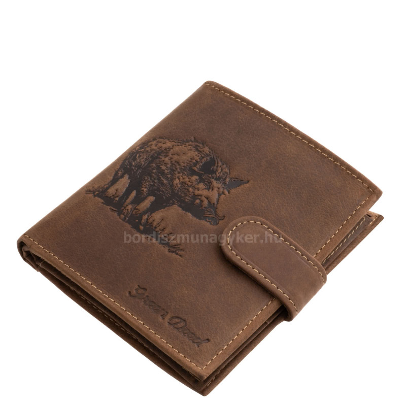 Valódi bőr férfi irattartó pénztárca, amelynek fedelét részletgazdag vaddisznó motívum díszíti, stílusos GreenDeed díszdobozos modell.