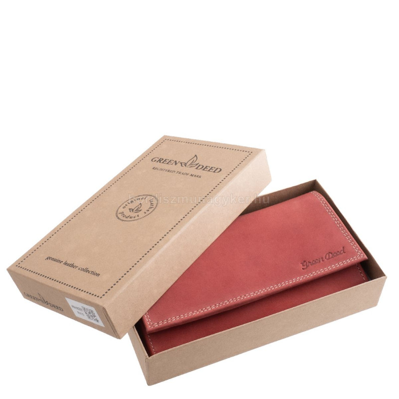 Divatos piros és fekete színben gyártott, puha tapintású valódi bőr női pénztárca, mely GreenDeed díszdobozban kapható nagy méretű termékünk.