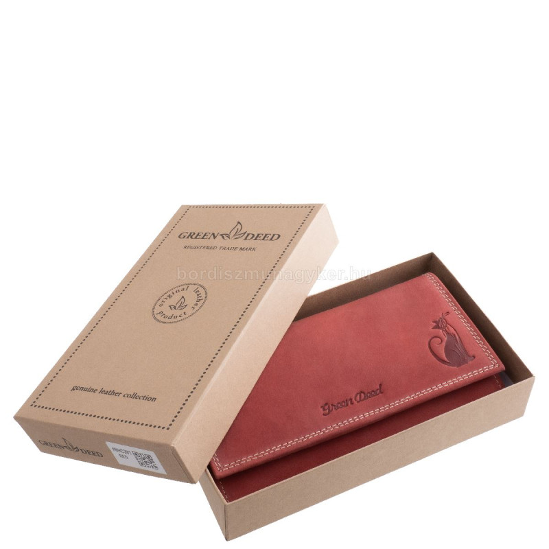 Fashionable red, soft-touch genuine leather women's wallet with cat decoration on the lid, large GreenDeed model available in a stylish gift box.