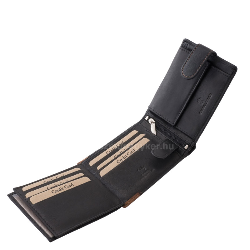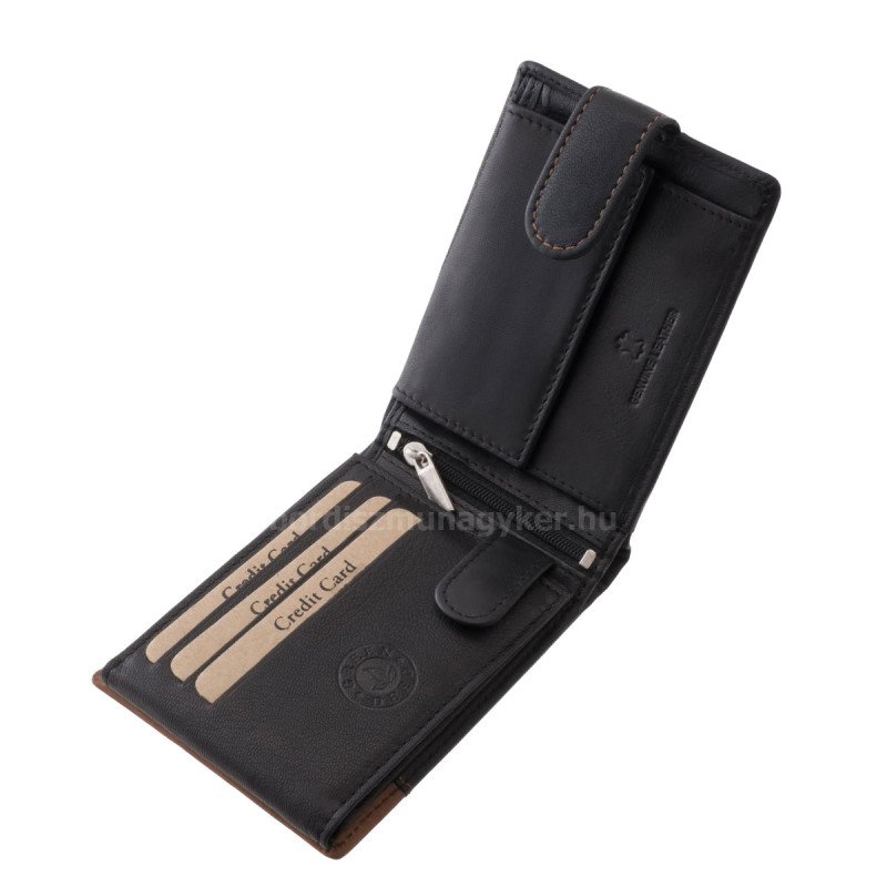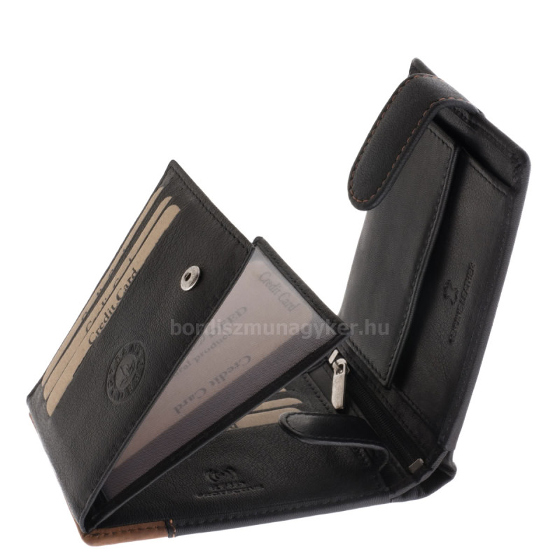 A modell fedelén patentos átkapcsoló pánt található, amely biztonságosan összezárja a pénztárcát, így tartalma nagyobb biztonságban van.