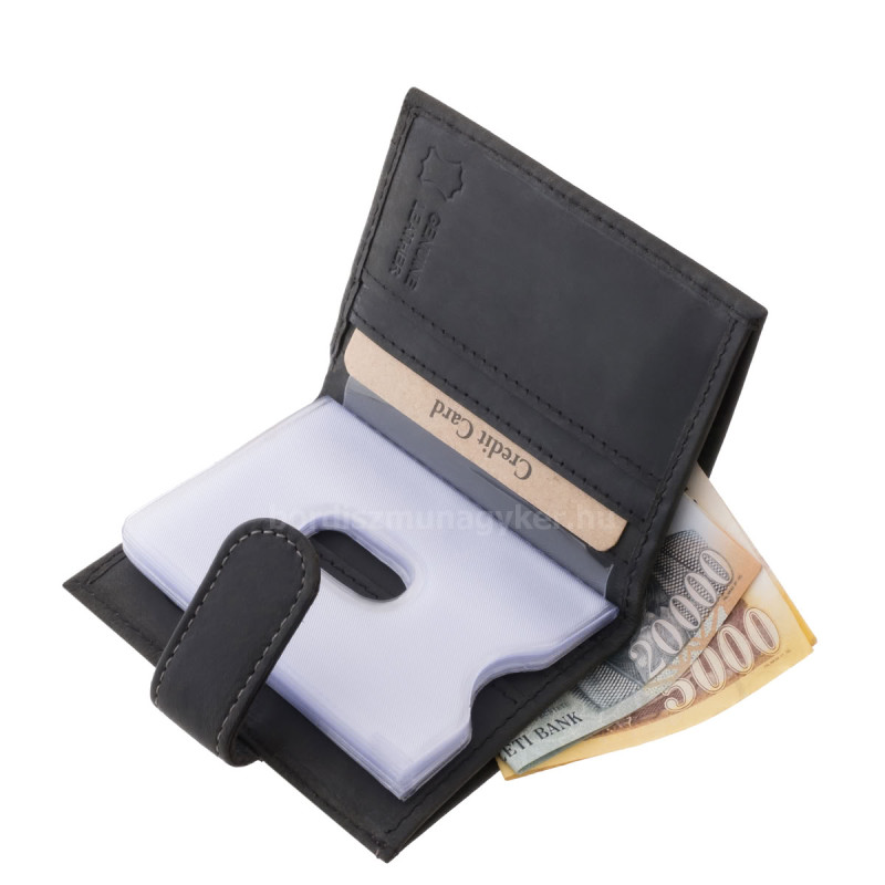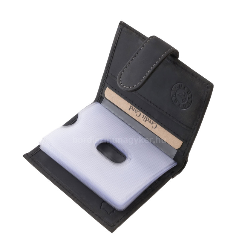 A modell fedelét egy patenttal záródó átkapcsoló pánt fogja össze, amely biztonságosan tartja zárva a kártyákat, miközben jól illik a természetes bőr karakteréhez.