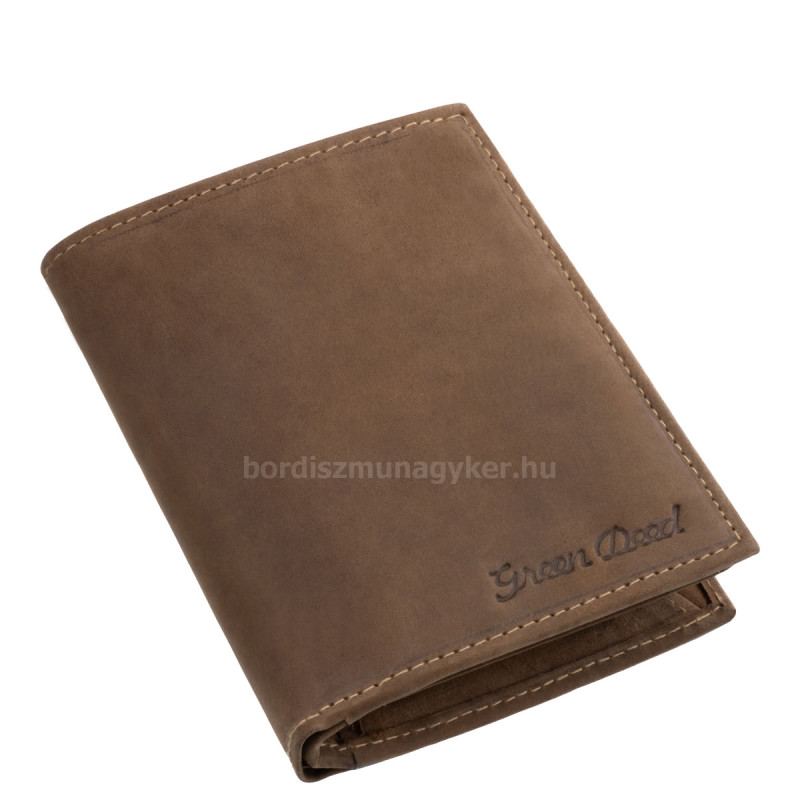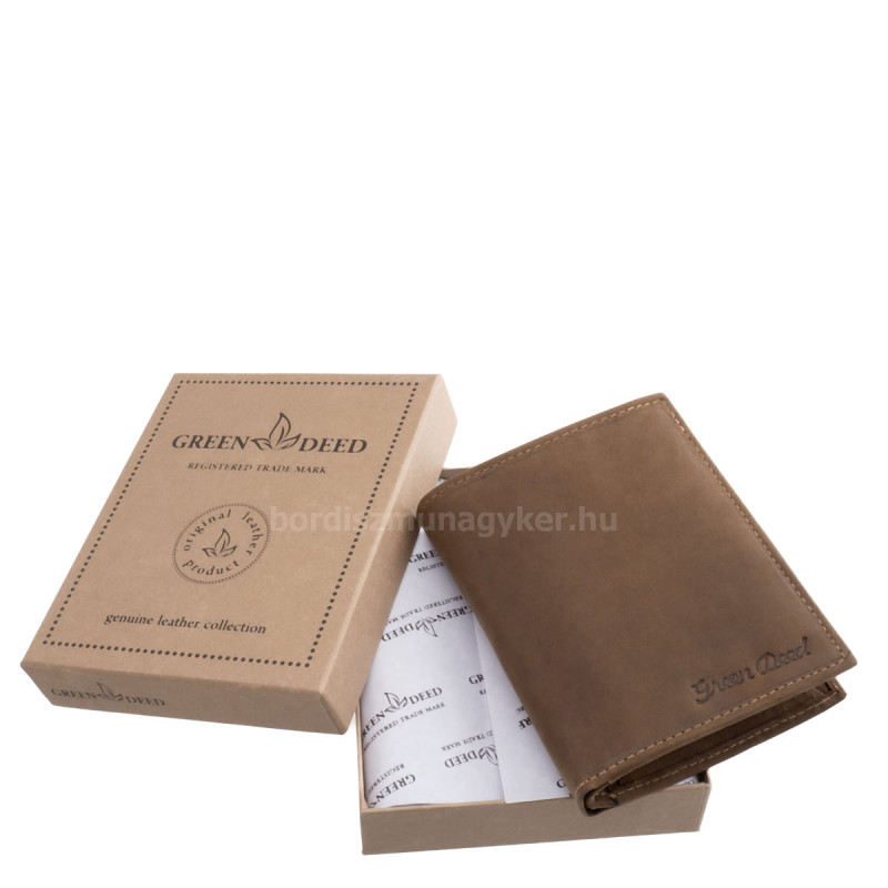 Álló kivitelű, természetes hatású, valódi bőr férfi irattartó pénztárca a GreenDeed márkacsaládtól, elegáns díszdobozban.