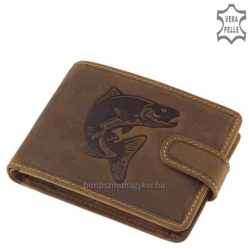 Marque GREEN DEED , portefeuille pour homme de pêcheur en cuir de vachette naturel et véritable. Une image réaliste d'une perche a été placée dans sa couverture. Le portefeuille a une disposition interne pratique : il a un porte-monnaie qui se ferme avec un couvercle verni, peut être fermé avec une languette de commutation, un porte-documents et cartes avec une tong et un porte-monnaie avec un double compartiment. A l'intérieur se trouve une poche verticale zippée au milieu pour les documents importants. Sangle de commutation externe.