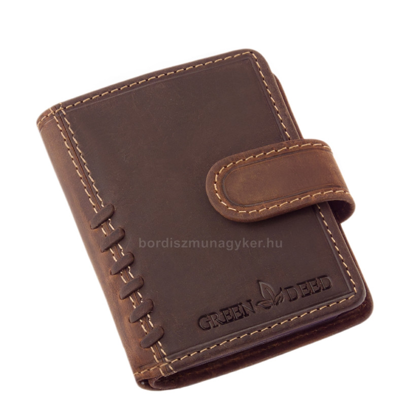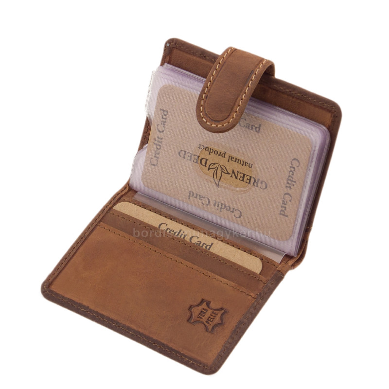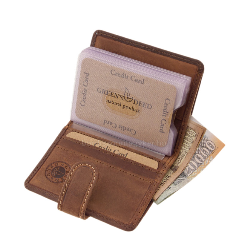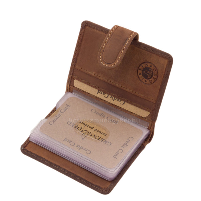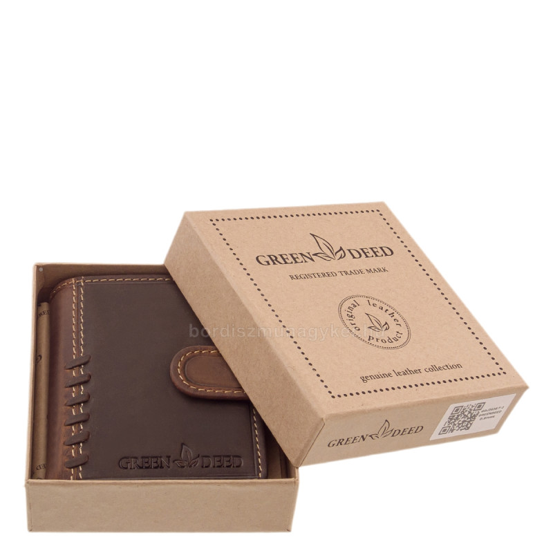 GreenDeed márkás, valódi bőr, álló kártyatartó modell, mutatós díszdobozba csomagolva, egyedi díszfűzéssel és praktikus belsővel.