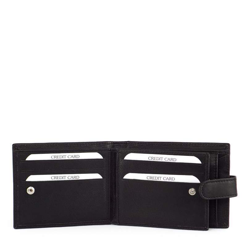 Kellemes tapintású,tartós nappa bőrből készült klasszikus férfi pénztárca patenttal zárható átkapcsoló nyelvvel, La Scala logóval. Belül található két darab papírpénztartó rekesz és egy darab aprópénztartó zseb, melynek fedele patenttal záródik. Másik oldalán további, kihajtható kártya- és irattartók helyezkednek el, amelyek patenttal rögzíthetőek.