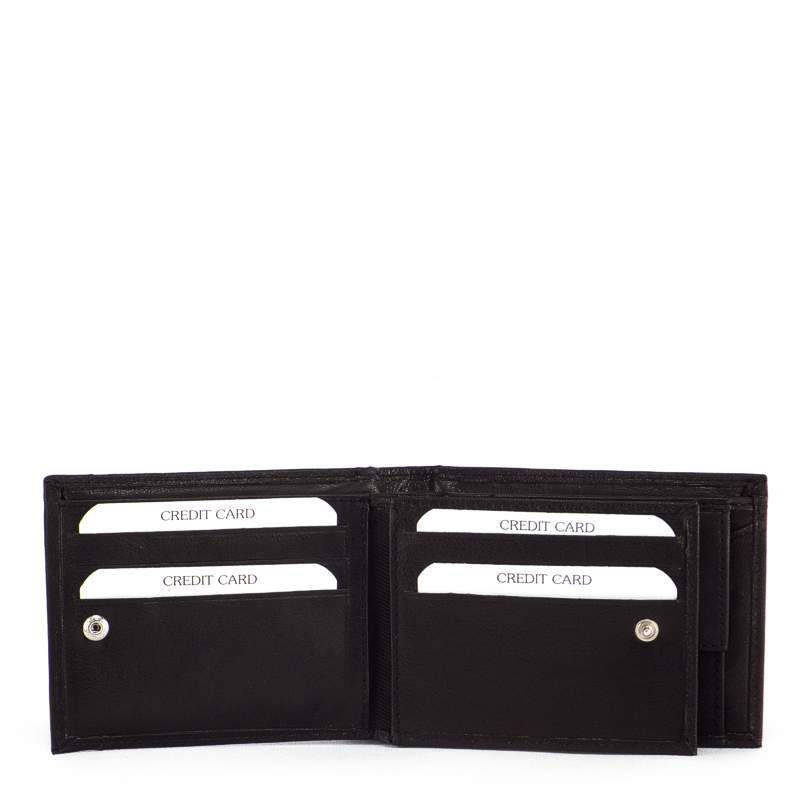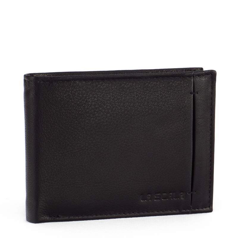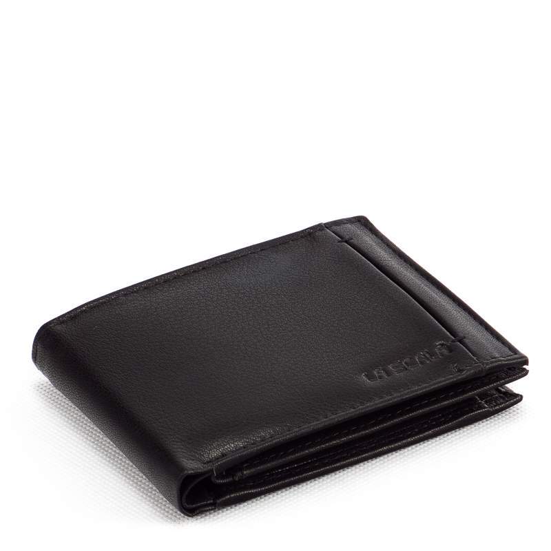 Klasyczny portfel męski wykonany z wytrzymałej, przyjemnej w dotyku skóry nappa, z logo La Scala i powściągliwym ozdobnym pokrowcem. Wewnątrz znajdują się dwie przegródki na banknoty oraz kieszonka na monety zapinana na zamek. Z drugiej strony znajdują się dodatkowe składane uchwyty na karty i akta, które można zabezpieczyć patentem.