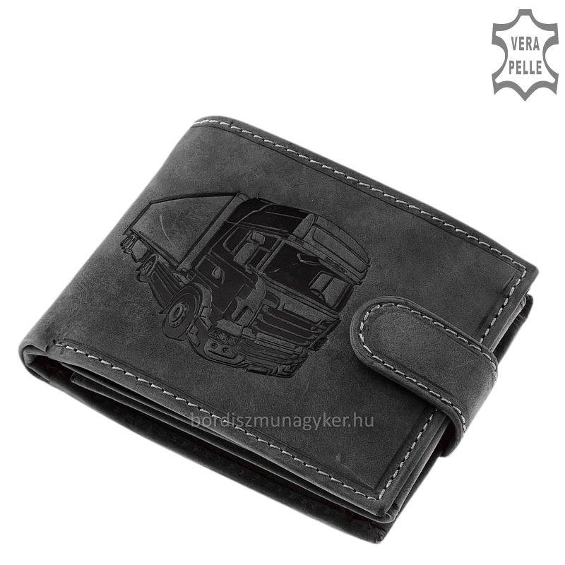 A bőr pénztárca elején látható az egyediséget sugárzó kamion részletgazdag kidolgozású mintája.