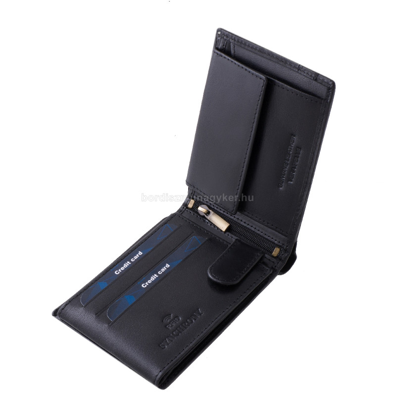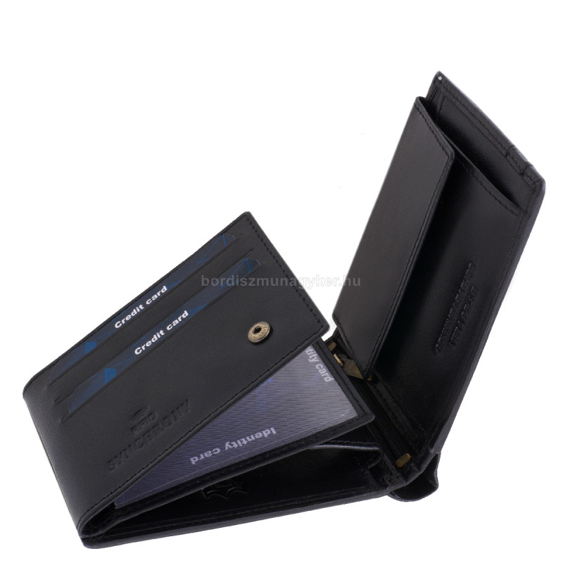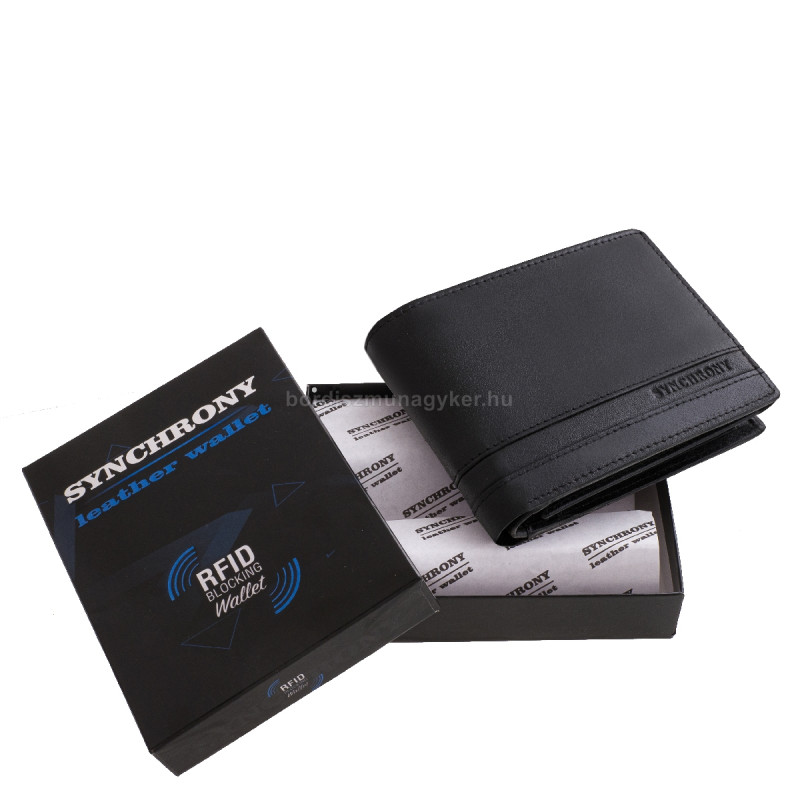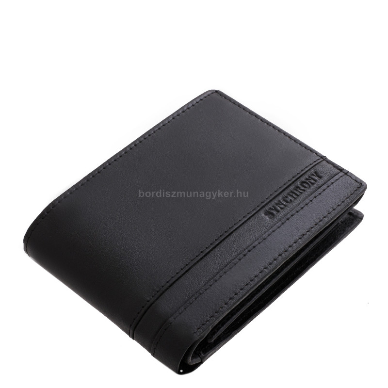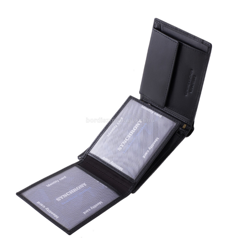Klassisches zweiseitiges Echtleder-Portemonnaie für Herren. In Schwarz mit edlem SYNCHRONY Logo auf dem Deckel. Praktisch tragbares Modell in der Gesäßtasche. Das Produkt ist mit einer RFID-Folie ausgestattet, die unsere Geldbörse und Dokumente noch sicherer macht.