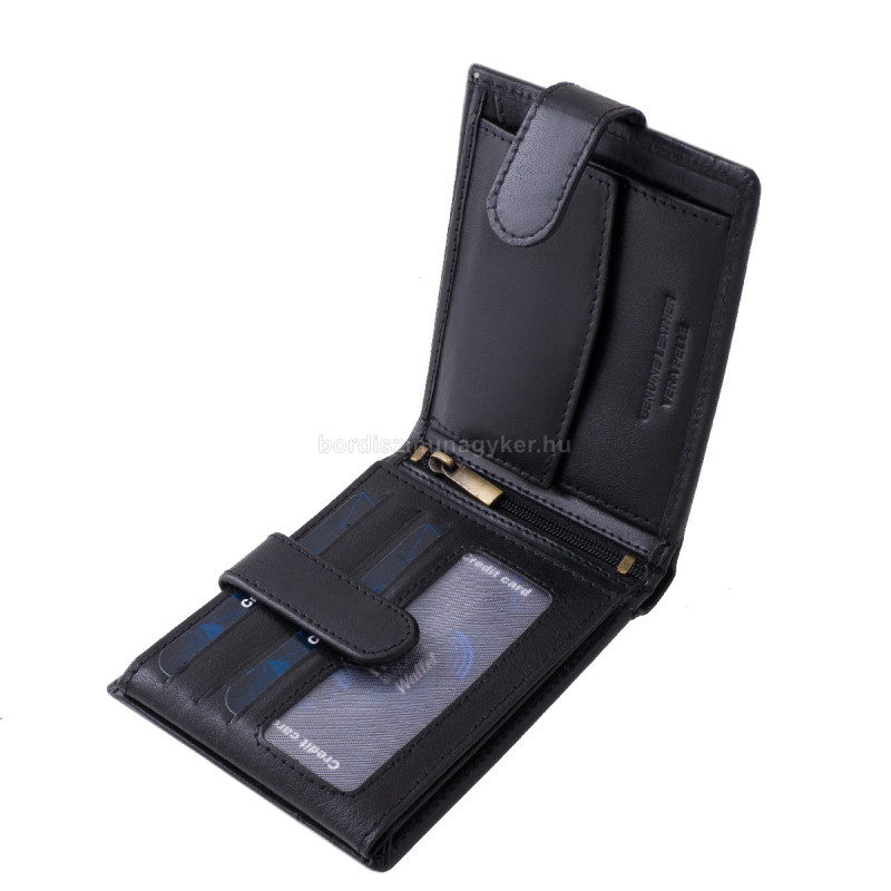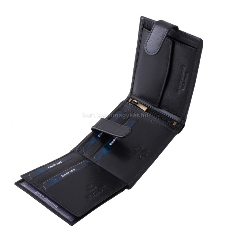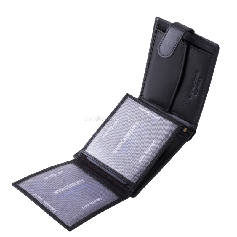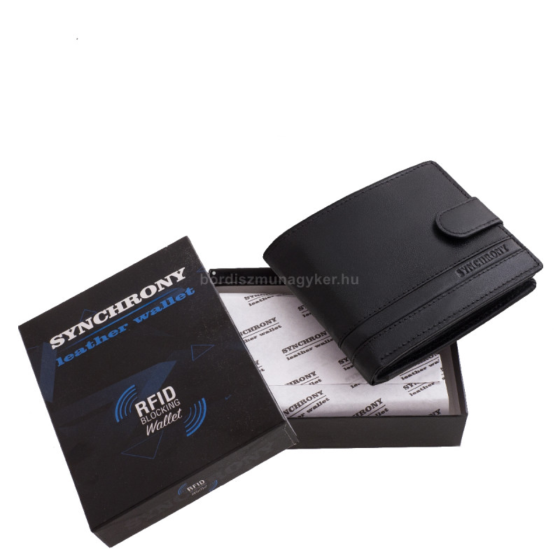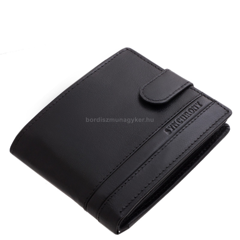 Szép kivitelű valódi marhabőrből készített SYNCHRONY logó kidomborodott benyomásával gyártott férfi bőr pénztárca fekete színben. A modell külső és belső átkapcsoló pánttal rendelkezik, így igazán nagy védelmet, biztonságot nyújt értékeinknek, okmányainknak. A termék RFID fóliával van ellátva ezzel még biztonságosabbá téve a pénztárcát és az iratainkat.