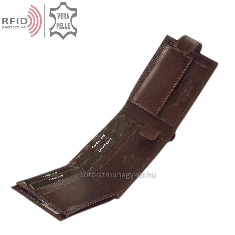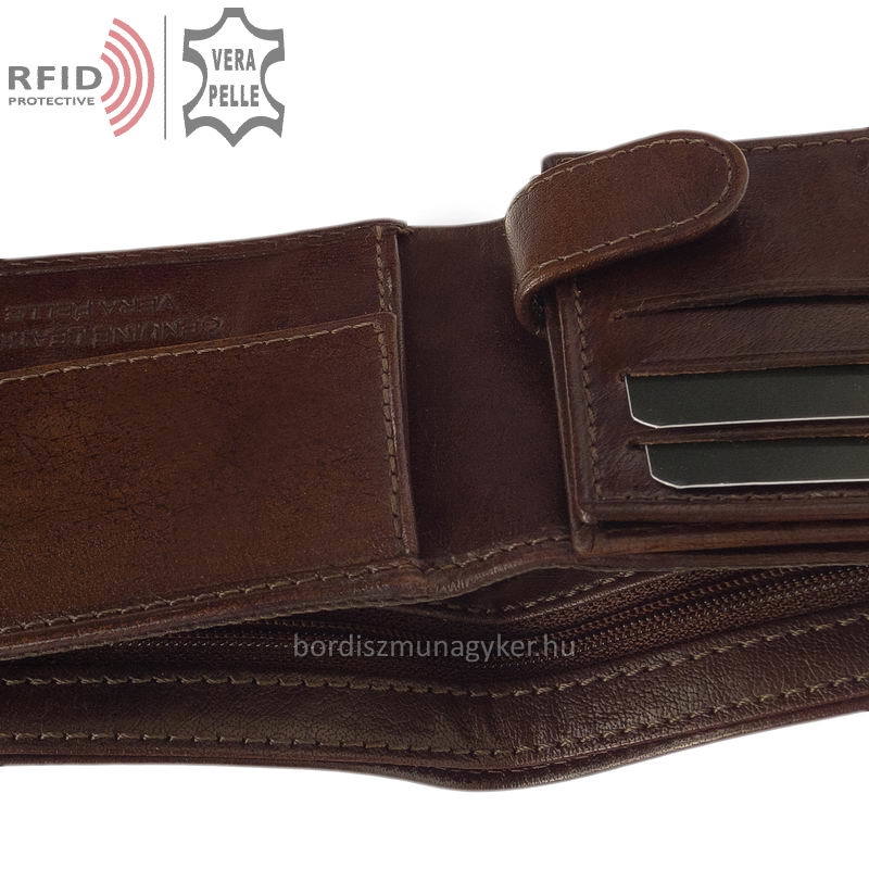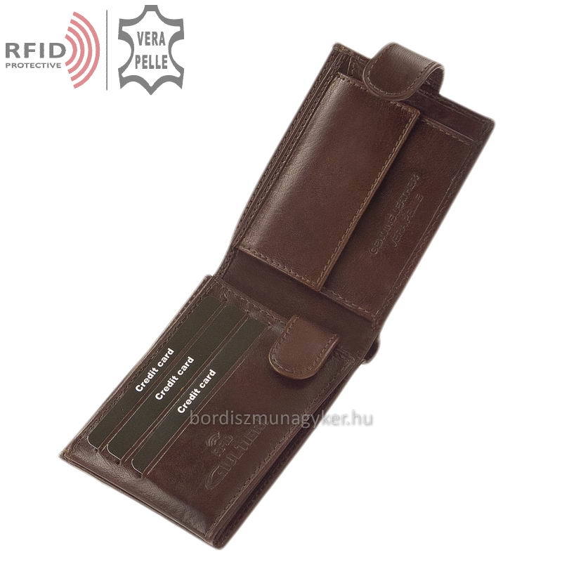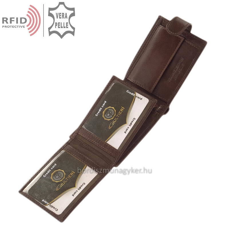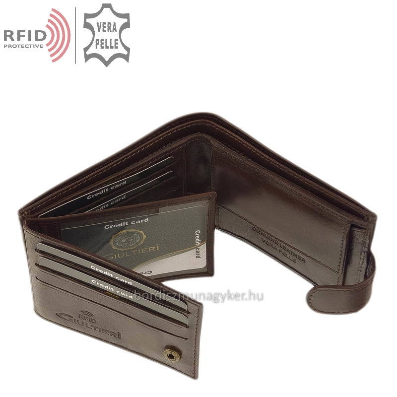 Exkluzivní design, značka Giultieri, peněženka z hovězí kůže z pravé kůže v tmavě hnědé barvě. Snadno se nosí v zadních kapsách a menších kapsách. Produkt je vybaven RFID fólií, díky čemuž je naše peněženka a dokumenty ještě bezpečnější.