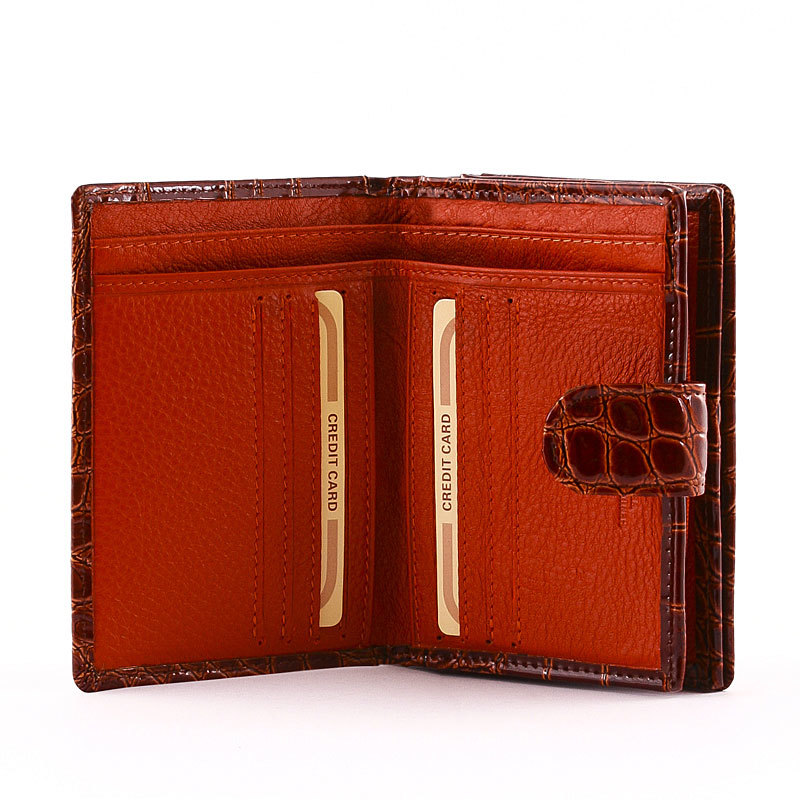 Skórzany portfel damski ze wzorem krokodyla, kieszonki na karty i zamykane kieszonki na dokumenty, zewnętrzny włącznik patentowy. W kolorze brązowym . Wewnątrz portfela znajduje się mały uchwyt na monety zapinany na zamek. Z dwoma kawałkami papierowego uchwytu na banknoty.