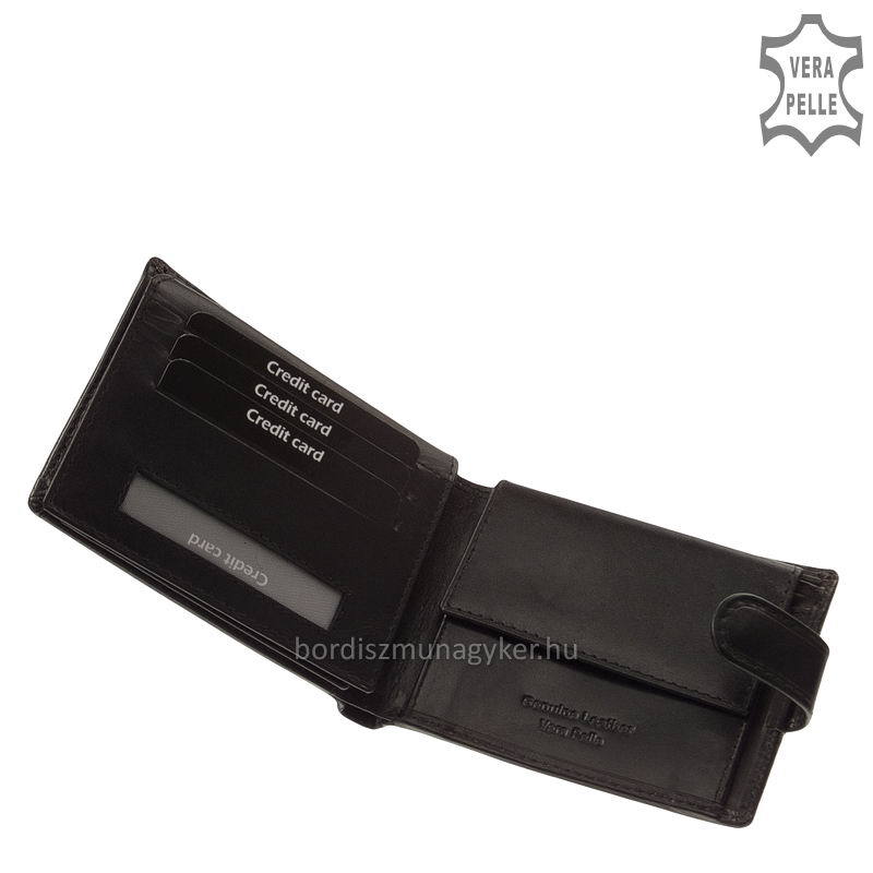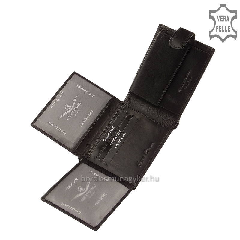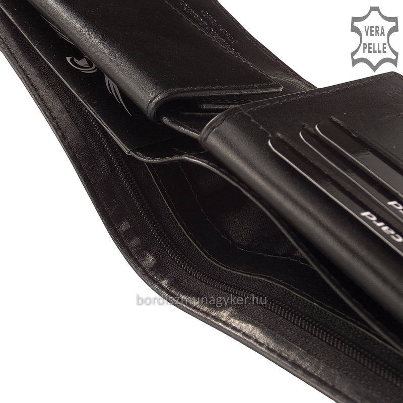 Изключителен мъжки портфейл с марка CORVO BIANCO в черно, изработен от висококачествена копринена гланцова кожа. Корицата на портфейла е с елегантна кожена лента с декоративна бродерия, за която сме проектирали уникален, впечатляващ дизайн. Практичен модел на вътрешно оформление: външният му превключвател се затваря с патентован език, вътре в него има карта и държач за карти, които могат да се сгъват наляво и нагоре. В портфейла имаше трима притежатели на хартиени пари, единият от които можеше да се заключва с цип - за банкноти с по -голям номинал. Вътре можете да намерите държач за монети с нормален размер.