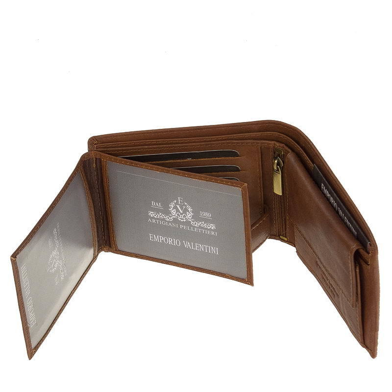 EMPORIO VALENTINI márkajelzésű világosbarna férfi pénztárca minőségi, finom tapintású marhabőrből legyártva. Belső elrendezése kifejezetten praktikus: lapozható kártya- és igazolványtartó résszel, kétrekeszes papírpénztartóval és patentos aprópénztartó zsebbel rendelkezik. Aprópénztartó zsebe alatt egy további irattartó rekesz, középen pedig egy függőleges, cipzáras zseb található.