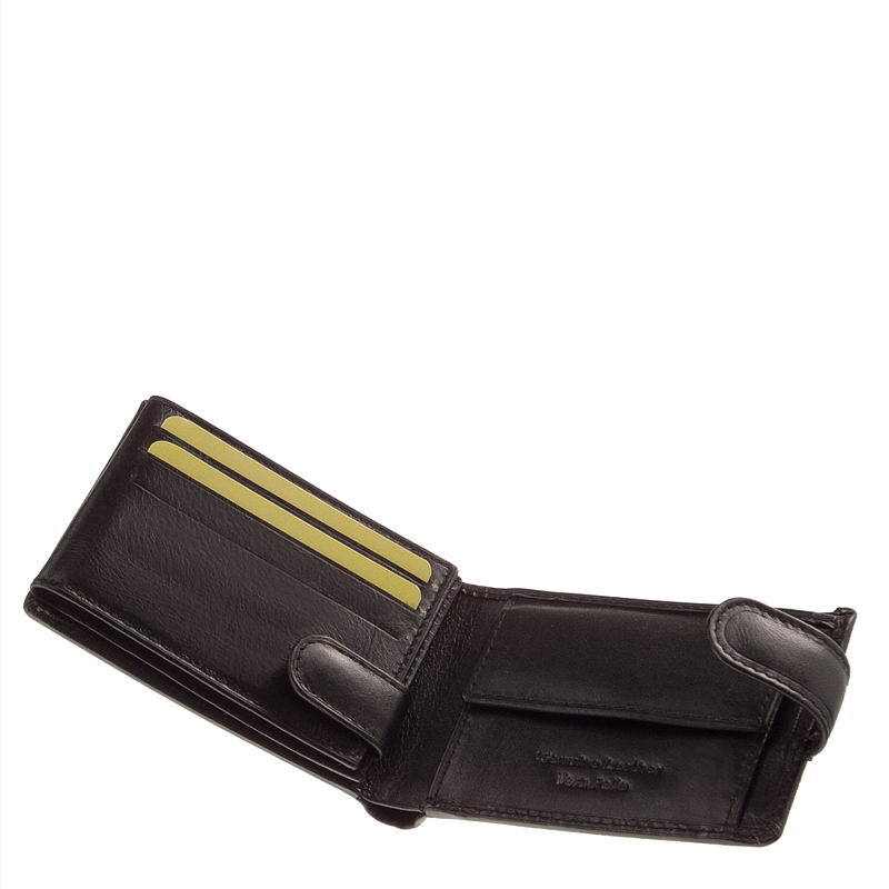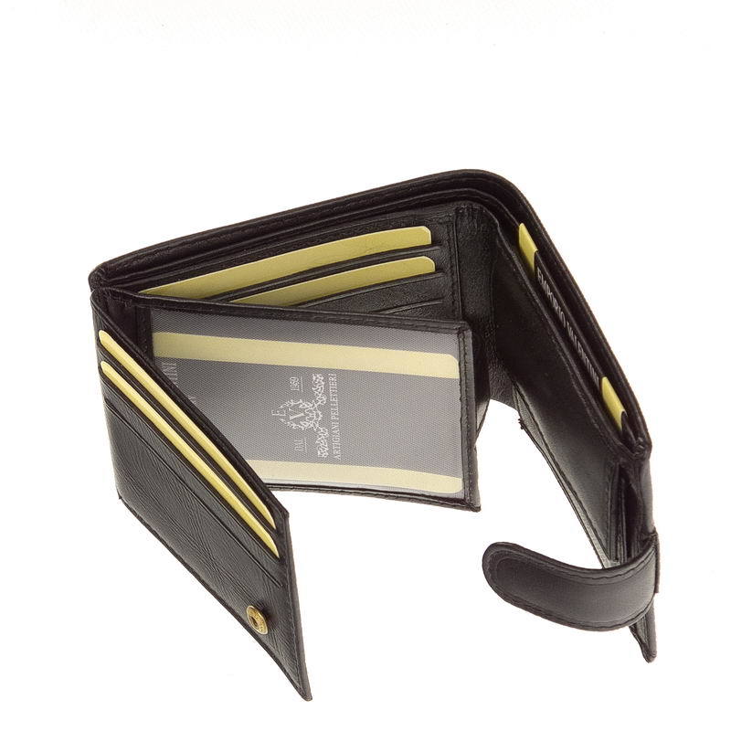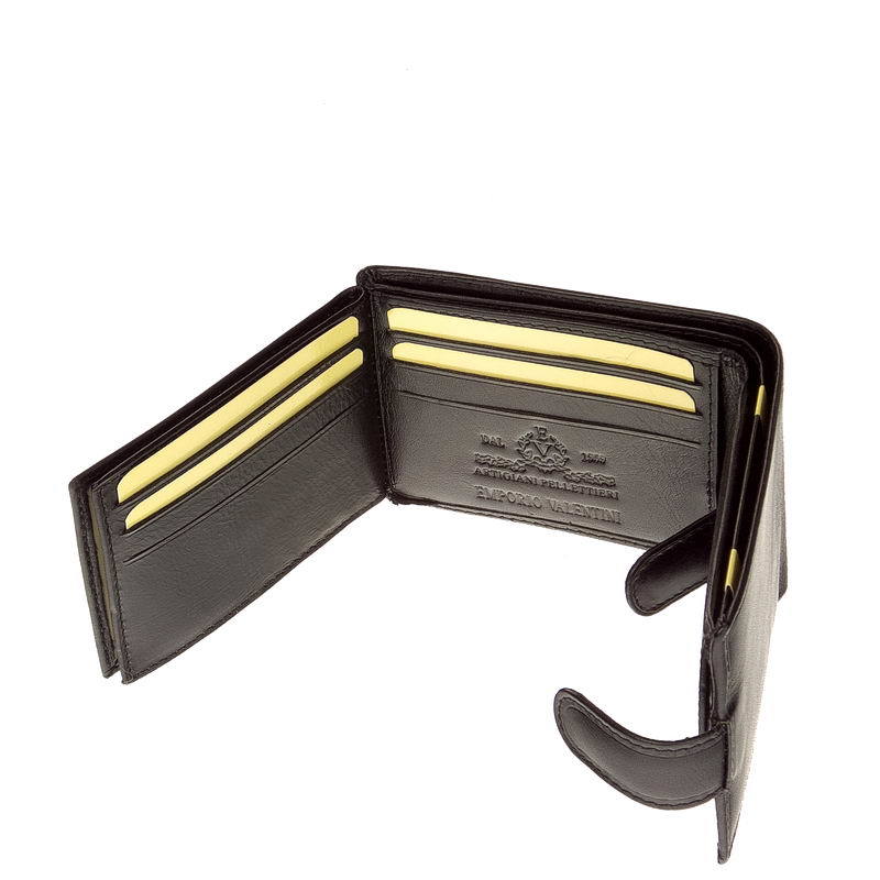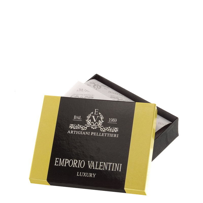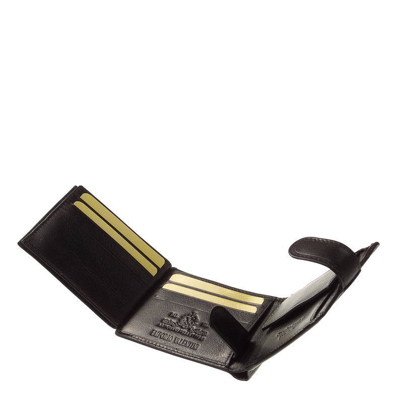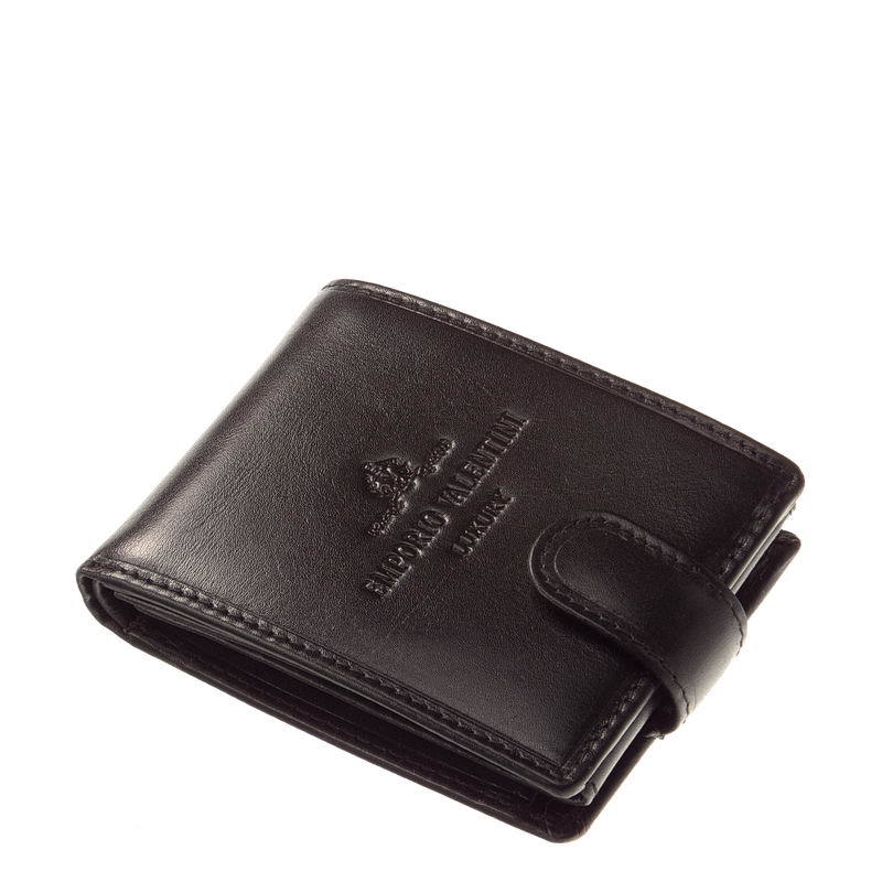 Mindre, praktisk sort mænds tegnebog fremstillet af førsteklasses kohud med kvalitetsarbejde. Coveret har en switch og et smukt EMPORIO VALENTINI LUXURY -indtryk. Indvendigt er der en traditionel møntlomme, vendte fil- og kortholdere og et to-rums papirpengerum, der alle er dækket med et logo-foret materiale.