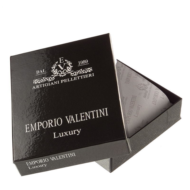 The wallet is packaged in an elegant black gift box with the text Emporio Valentini Luxury on the lid.