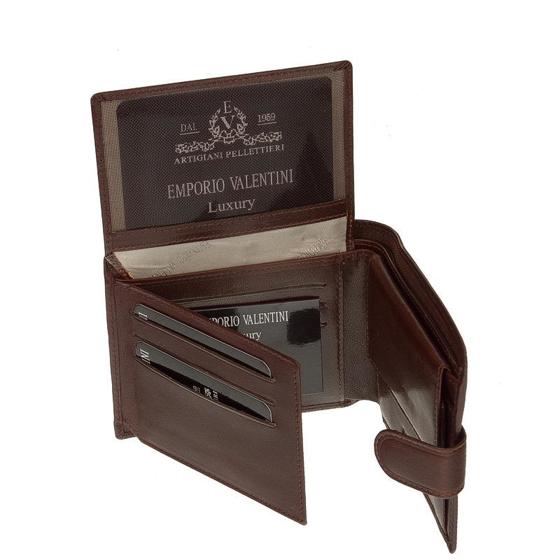 Elegant brown men's wallet made of high-quality cowhide with the Emporio Valentini logo embossed on the lid. The lid of the wallet closes with a switching tongue, inside it there is a card and card holder that can be folded to the left and up. Three purses of paper money were designed in the wallet, one of which could be locked with a zipper. Inside you can find the coin holder.