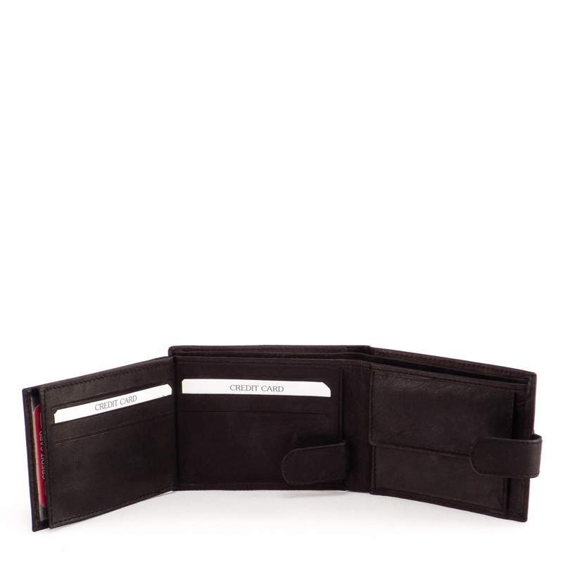 Marha bőrből készült fekete férfi pénztárca külső patentos átkapcsolóval, La Scala felirattal. Két darab papírpénztartóval, és egy darab patenttal zárható aprópénztartóval. Belül kihajtható kártya és irattartókkal, amelyek patentos kapcsolóval zárhatóak.
