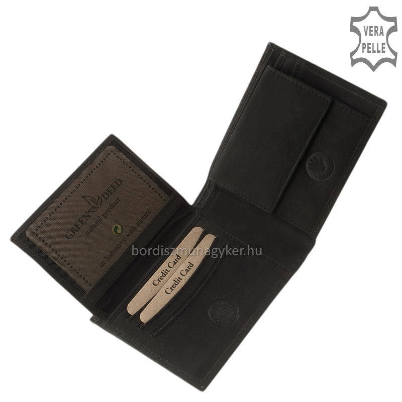 Természetes karakterű, masszív marhabőr férfi pénztárca GreenDeed márkanévvel a fedelén.