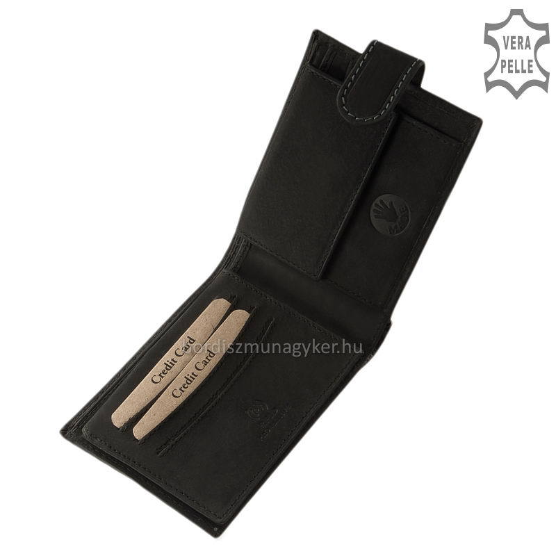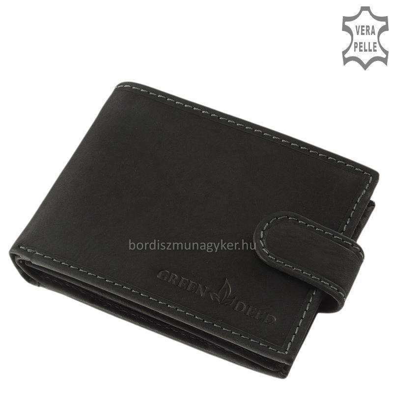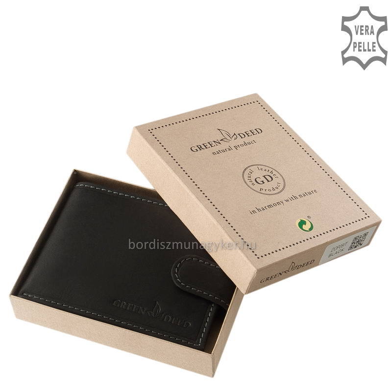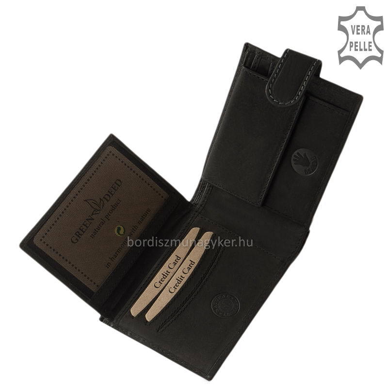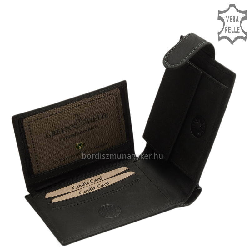 Természetes karakterű, masszív marhabőr férfi pénztárca GreenDeed márkanévvel a fedelén. Praktikusan kihasználható átkapcsoló pánttal rendelkező modell.