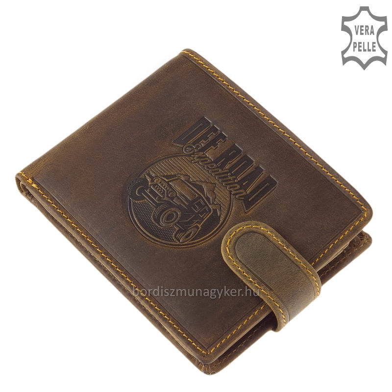 Rusztikus marhabőrből gyártott, GreenDeed márkajelzésű, barna színű férfi pénztárca terepjáró mintával.