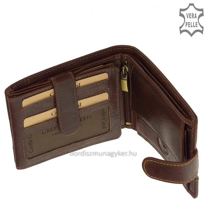 Temno rjava moška denarnica v slogu znakov iz kakovostnega usnja rustikalnega videza, izdelana pod blagovno znamko GreenDeed. Dekorativni pokrov lahko zaprete s stikalom. V notranjosti je na eni strani tradicionalno držalo za kovance, ki ga je mogoče zakleniti s patentnim pokrovom, na drugi strani pa držala za kartice in predelki za spise. Na hrbtni strani je držalo za denar v dveh predelkih, iz katerega je hrbet mogoče skriti z usnjenim trakom.