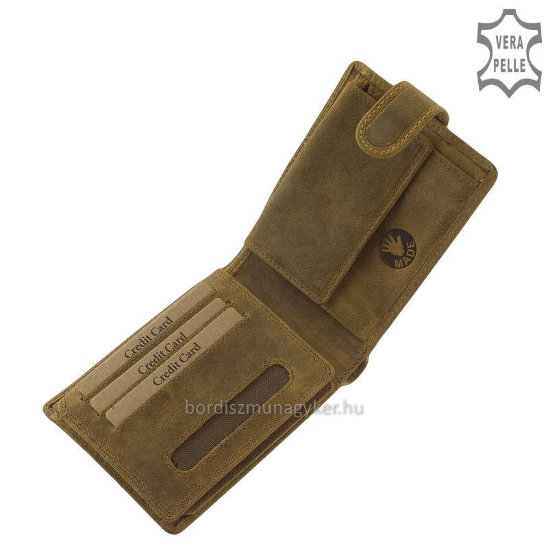 GreenDeed márkajelzésű termék, vastag, rusztikus marhabőrből készült. Külső átkapcsoló füllel rendelkező, praktikusan kihasználható modell.
