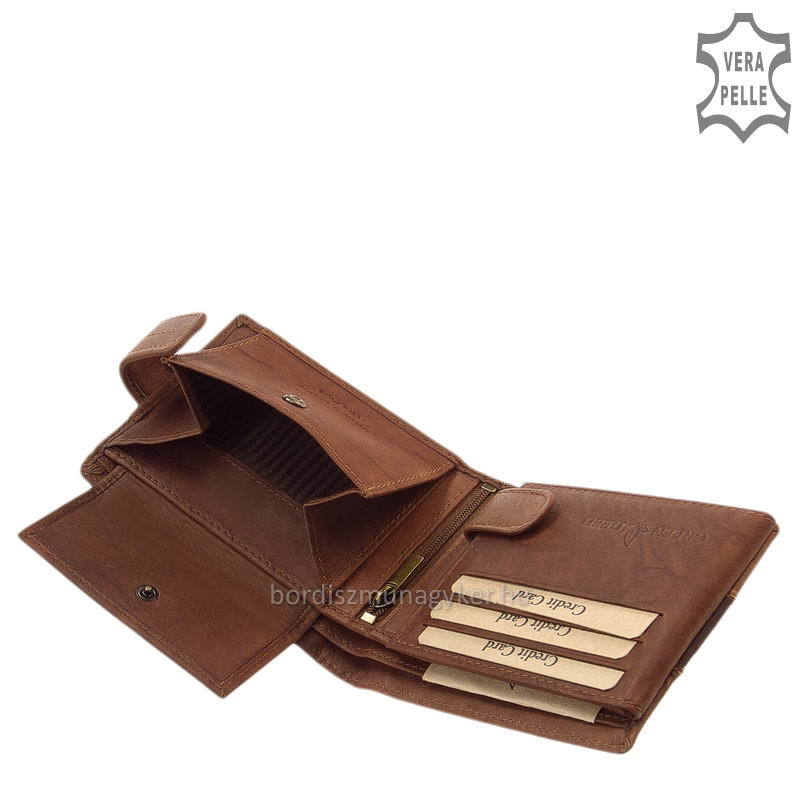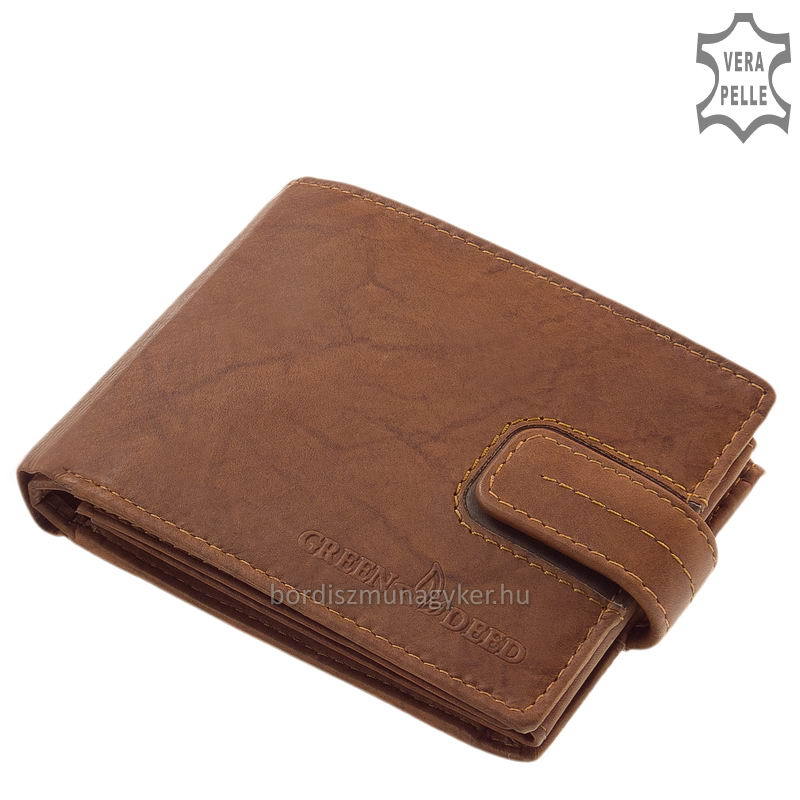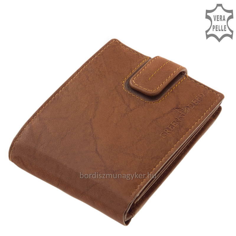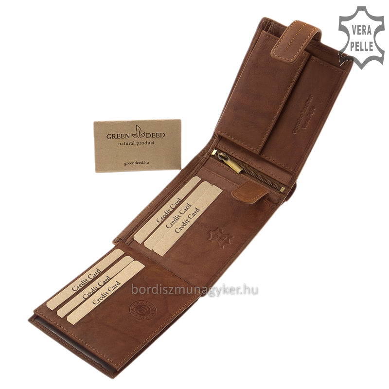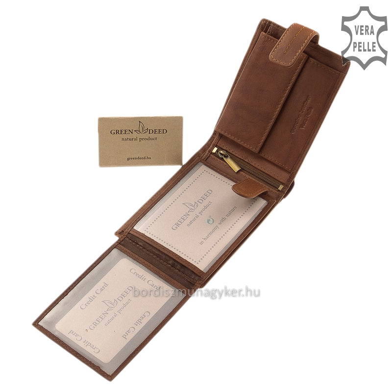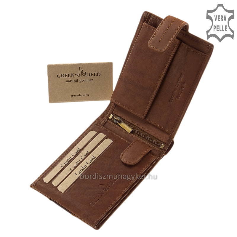 Mamy jasnobrązowy portfel z nowatorskim wieczkiem. Materiał to wysokiej jakości skóra bydlęca, bardzo przyjemna w dotyku i lekko postarzana. Portfel jest sportowy i ozdobiony logo GreenDeed.