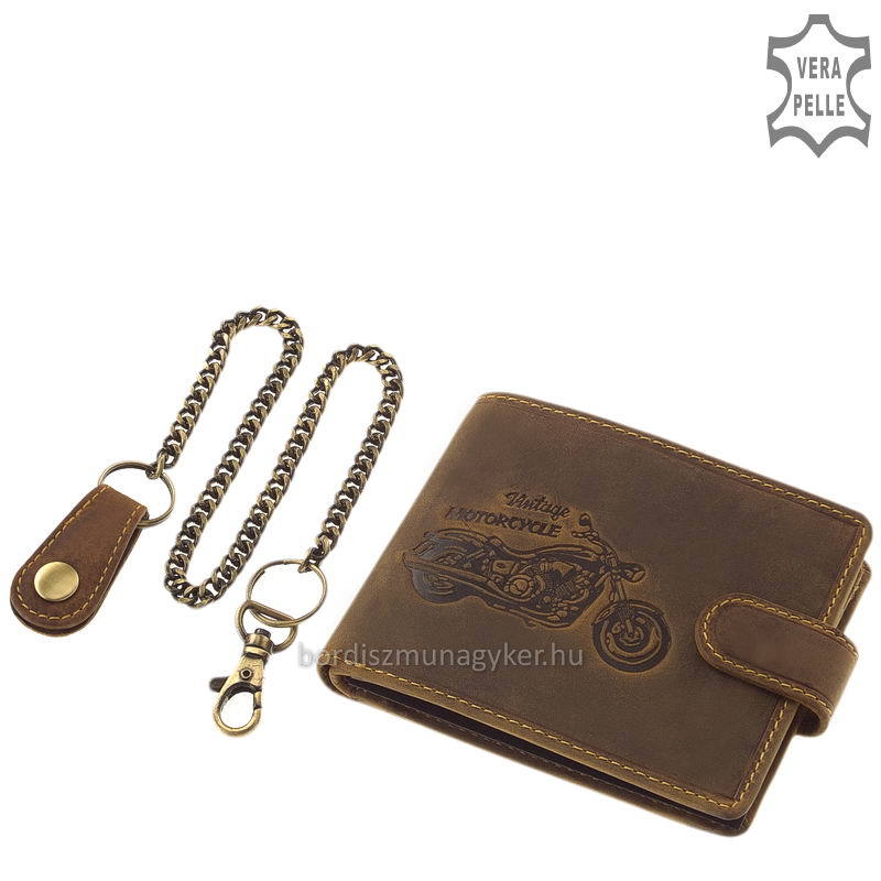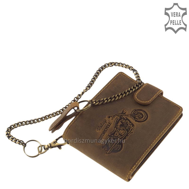 Marka GREEN DEED , muški novčanik za motocikle izrađen od prirodne, prave goveđe kože. Prekriveno detaljnom slikom motocikla. Novčanik ima praktičan unutarnji izgled: ima držač za novčiće koji se zatvara patentnim poklopcem, može se pričvrstiti jezičkom za prebacivanje, držač za dokumente i kartice s japankom i držač za papirnati novac s dvostrukim pretincem. Unutra se nalazi uspravni džep s patentnim zatvaračem u sredini za važne dokumente. Dolazi s lancem u boji starine koji se može pričvrstiti na držač pojasa hlača. Vanjski prekidač.