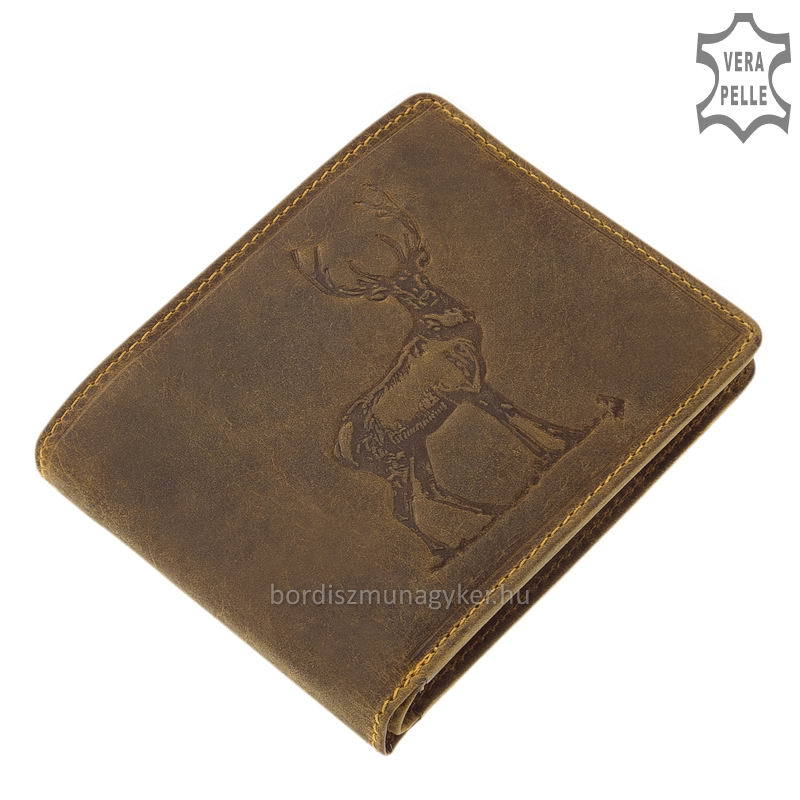 Kitűnő minőségű férfi vadász pénztárca, amely valódi marhabőrből készült. A termék fedelét egy gímszarvas képe díszíti, belsejében további emblémák kerültek benyomásra.