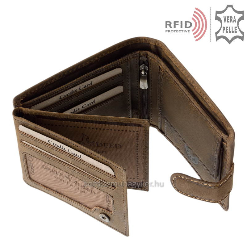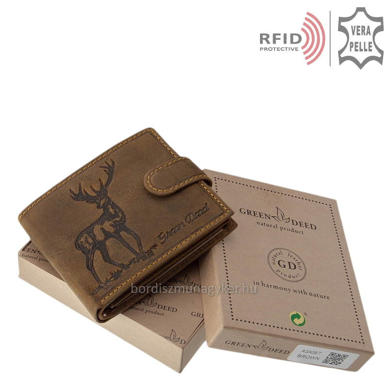 Markowy męski portfel myśliwski GreenDeed we wzorzystym kroju z ochroną RFID, wykonany z wysokiej jakości skóry, jako dodatek w pudełku upominkowym.