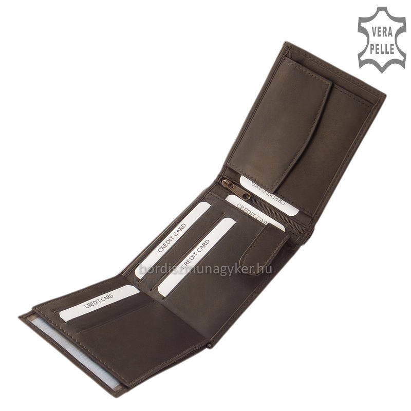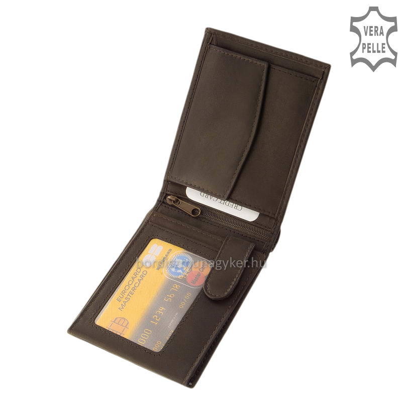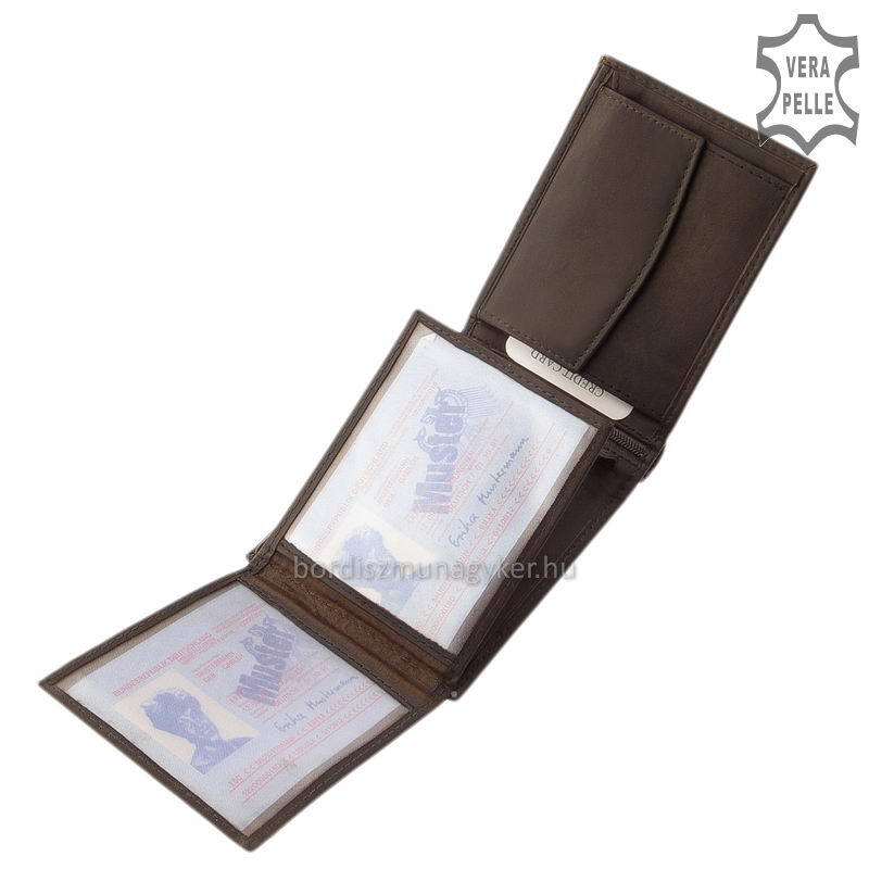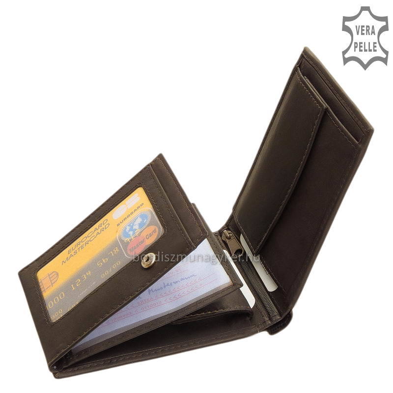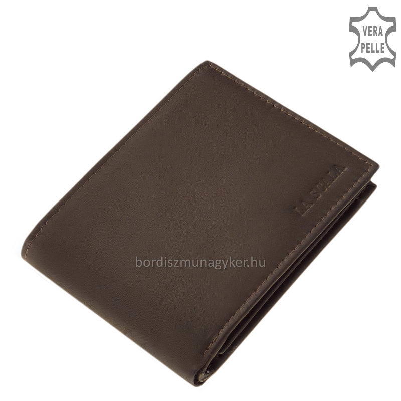 Marha bőrből készült barna színű férfi pénztárca, La Scala felirattal. Két darab papírpénztartóval, és egy darab patenttal zárható aprópénztartóval. Belül kihajtható kártya és irattartókkal, amelyek patentos átkapcsolóval zárhatóak. Az irattartók közül az egyik cipzárral zárható.