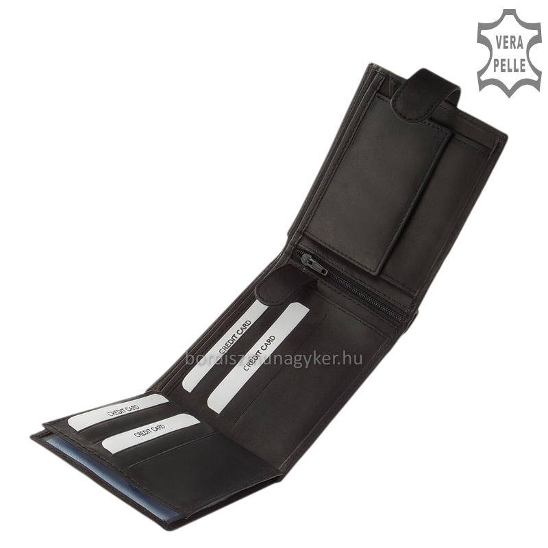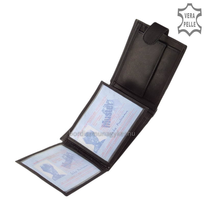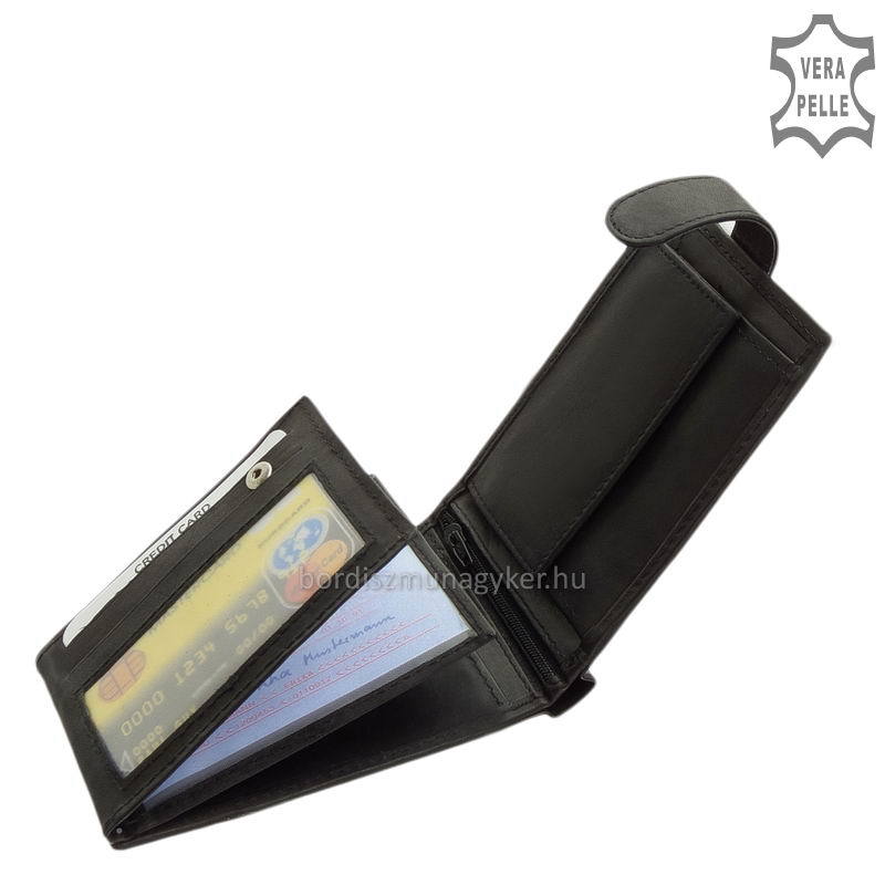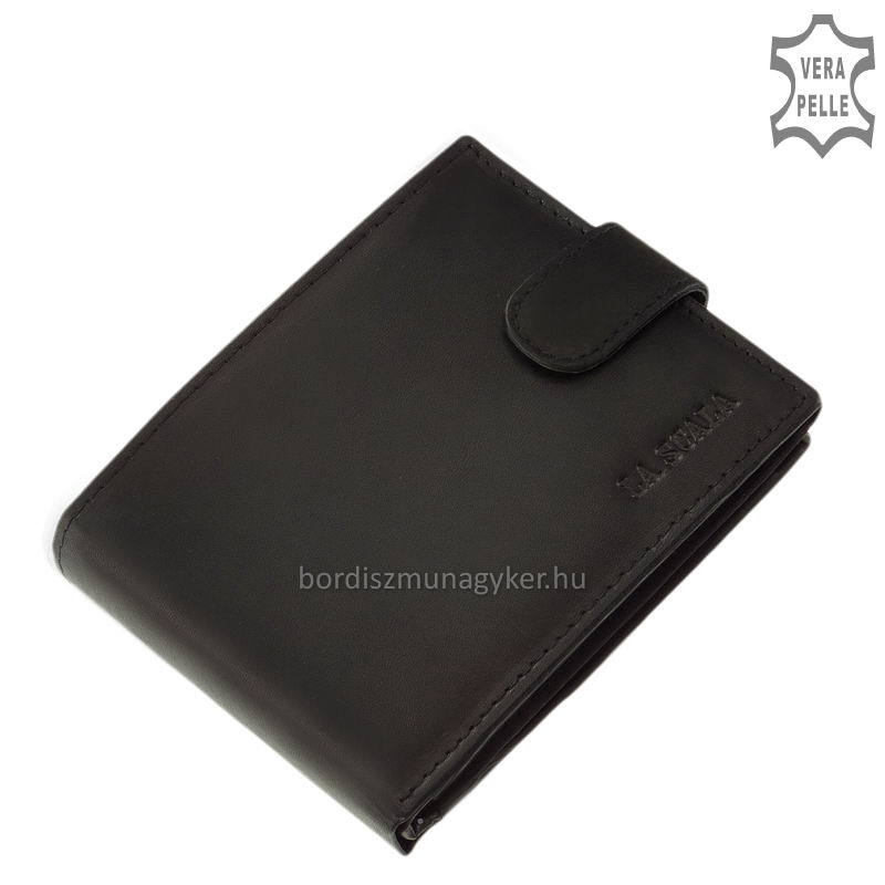 Black men's wallet made of cow leather with external patent switch with the inscription La Scala. With two paper money holders and one patent lockable coin holder. With fold-out card inside and file holders that can be locked with an external patent switch. One of the file cabinets can be locked with a zipper.