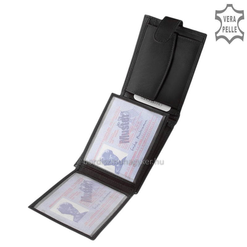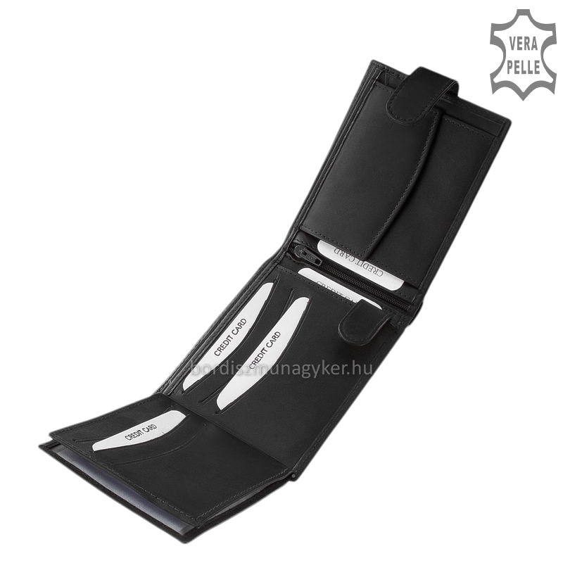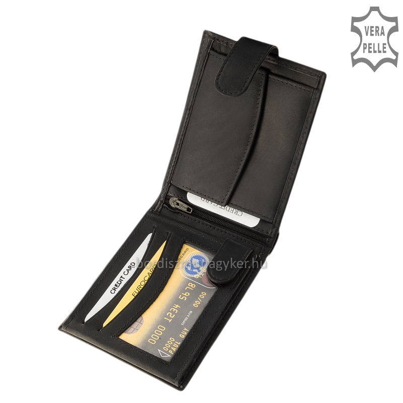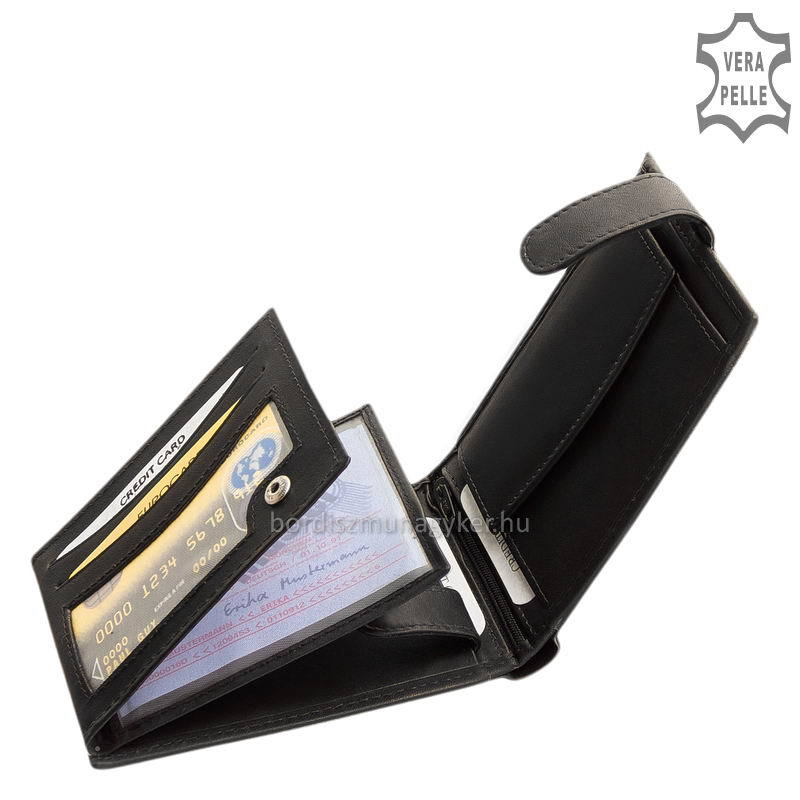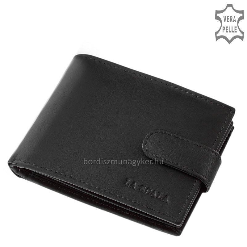 Portofel negru pentru bărbați din piele de vacă cu comutator de brevet extern cu inscripția La Scala. Cu doi suporturi de bani de hârtie și un suport de monede care poate fi închis cu brevet. Cu card pliant și lianți în interior, care pot fi blocate cu un comutator brevetat. Unul dintre dulapurile cu fișiere poate fi blocat cu fermoar.